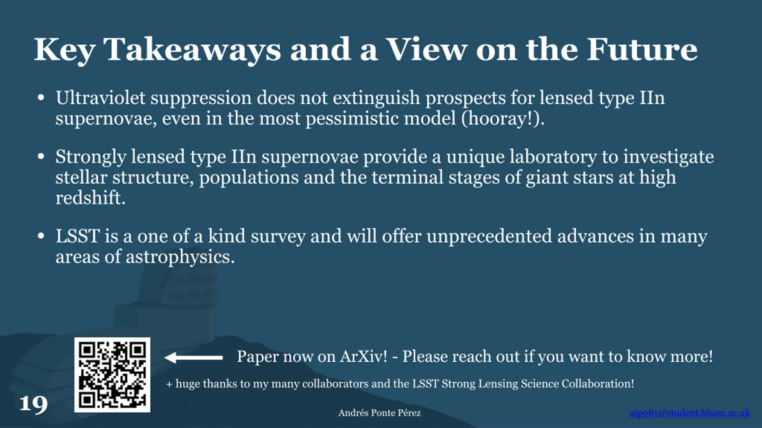Key Takeaways and a View on the Future Ultraviolet suppression does not extinguish prospects for lensed type IIn supernovae, even in the most pessimistic model (hooray!). Strongly lensed type IIn supernovae provide a unique laboratory to investigate stellar structure, populations and the terminal stages of giant stars at high redshift. LSST is a one of a kind survey and will offer unprecedented advances in many areas of astrophysics. Paper now on ArXiv! - Please reach out if you want to know more! + huge thanks to my many collaborators and the LSST Strong Lensing Science Collaboration! 19 Andr s Ponte P rez aip981@student.bham.ac.uk