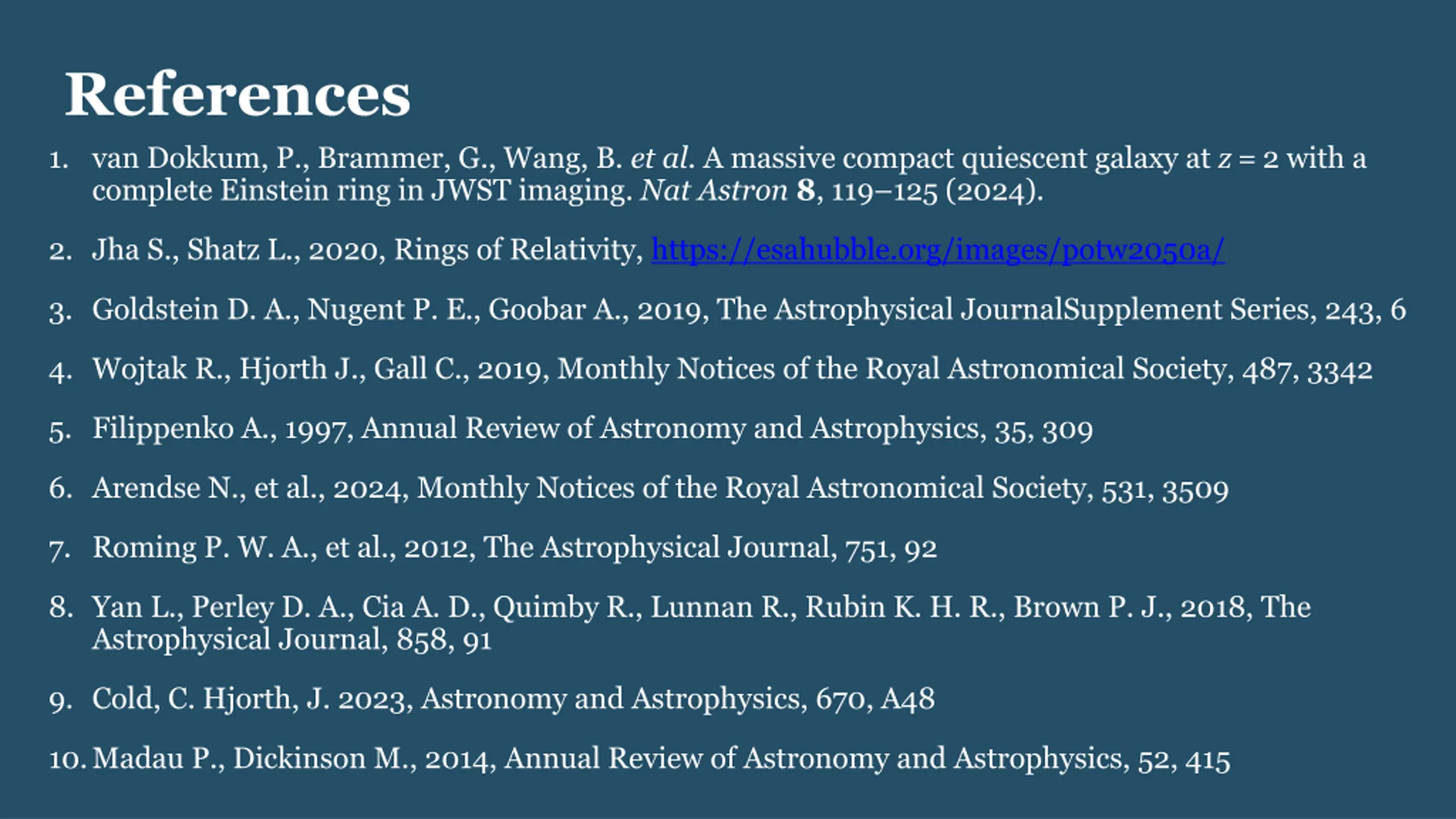 References 1. van Dokkum, P., Brammer, G., Wang, B. et al. A massive compact quiescent galaxy at z = 2 with a complete Einstein ring in JWST imaging. Nat Astron 8, 119 125 (2024). 2. Jha S., Shatz L., 2020, Rings of Relativity, https://esahubble.org/images/potw2050a/ 3. Goldstein D. A., Nugent P. E., Goobar A., 2019, The Astrophysical JournalSupplement Series, 243, 6 4. Wojtak R., Hjorth J., Gall C., 2019, Monthly Notices of the Royal Astronomical Society, 487, 3342 5. Filippenko A., 1997, Annual Review of Astronomy and Astrophysics, 35, 309 6. Arendse N., et al., 2024, Monthly Notices of the Royal Astronomical Society, 531, 3509 7. Roming P. W. A., et al., 2012, The Astrophysical Journal, 751, 92 8. Yan L., Perley D. A., Cia A. D., Quimby R., Lunnan R., Rubin K. H. R., Brown P. J., 2018, The Astrophysical Journal, 858, 91 9. Cold, C. Hjorth, J. 2023, Astronomy and Astrophysics, 670, A48 10.Madau P., Dickinson M., 2014, Annual Review of Astronomy and Astrophysics, 52, 415