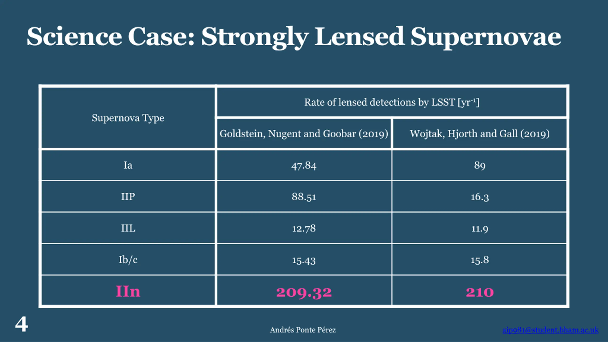 Science Case: Strongly Lensed Supernovae WIDE DEEP Strong lensing is rare, roughly 1/1000 objects are strongly lensed. Supernovae evolve relatively fast around peak brightness. Cosmic supernova rate increases with distance. Probability of lensing increases with distance. FAST DEEP DEEP To date: 8 By 2035 with LSST: 0 1 2 3 5 10 50 100 500 1000+ 3 Andr s Ponte P rez aip981@student.bham.ac.uk