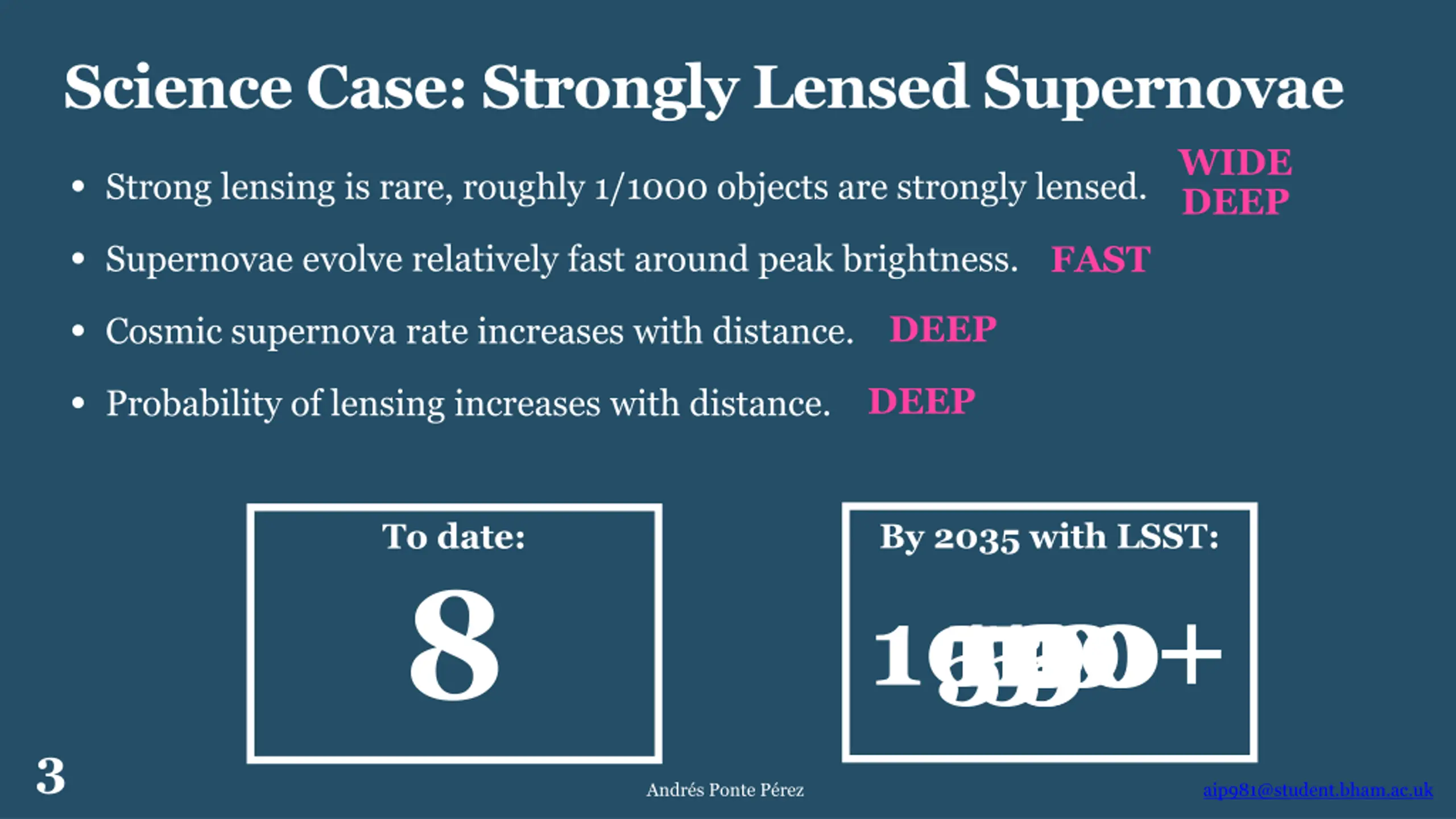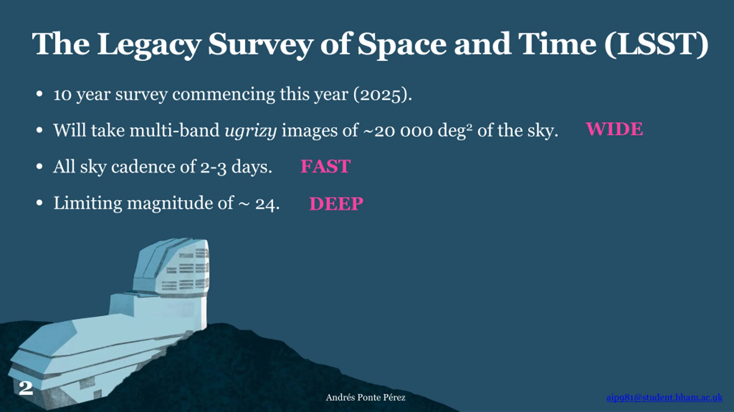 The Legacy Survey of Space and Time (LSST) 10 year survey commencing this year (2025). Will take multi-band ugrizy images of ~20 000 deg2 of the sky. All sky cadence of 2-3 days. Limiting magnitude of 24. WIDE FAST DEEP 2 Andr s Ponte P rez aip981@student.bham.ac.uk