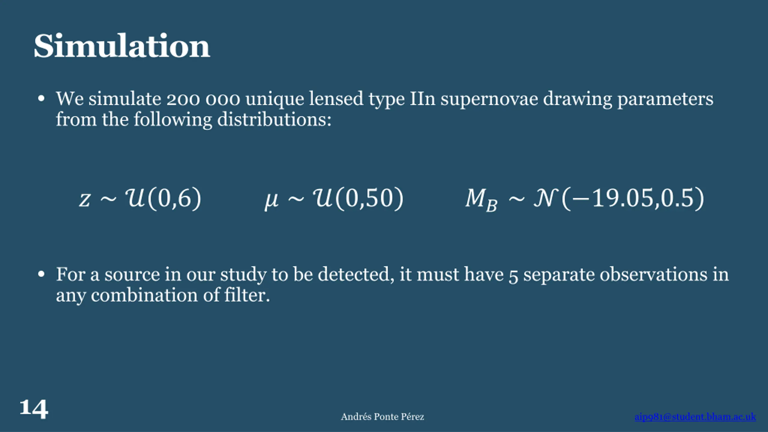 Simulation We simulate 200 000 unique lensed type IIn supernovae drawing parameters from the following distributions: ? ? 0,6 ? ? 0,50 ?? ? 19.05,0.5 For a source in our study to be detected, it must have 5 separate observations in any combination of filter. 14 Andr s Ponte P rez aip981@student.bham.ac.uk