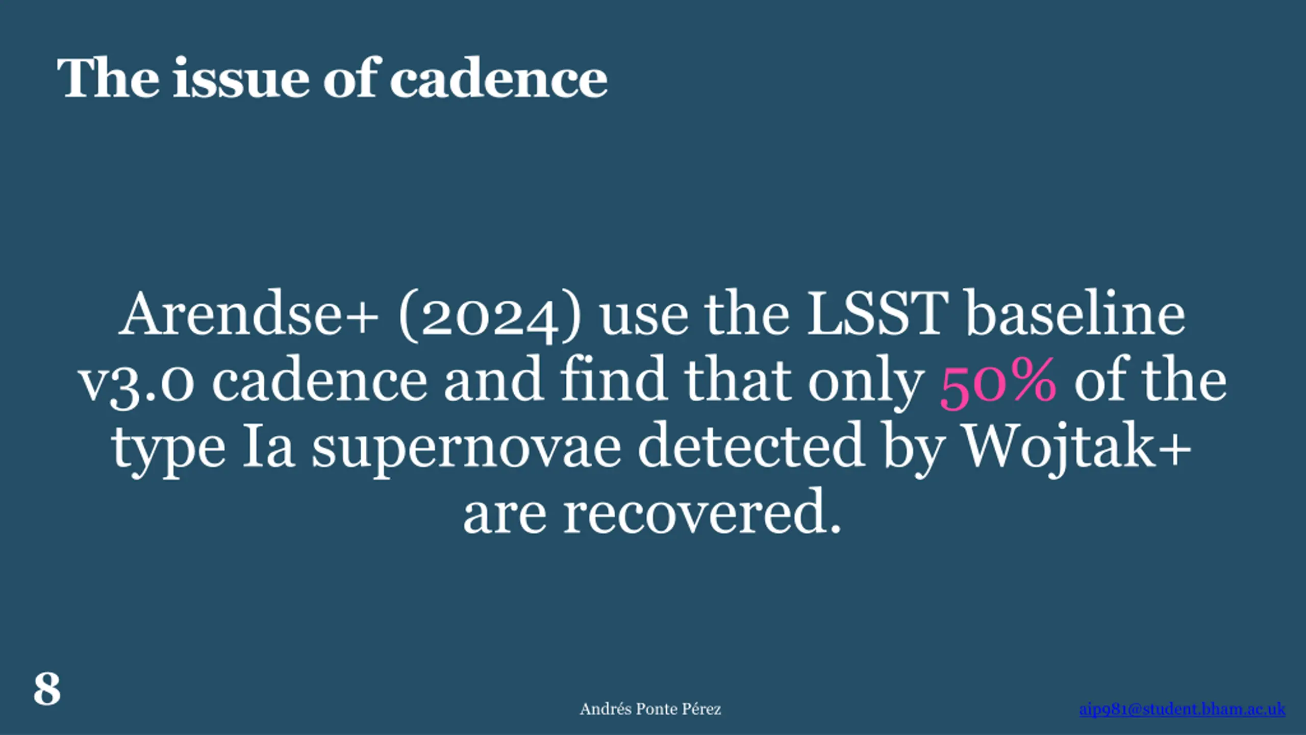 The issue of cadence Arendse+ (2024) use the LSST baseline v3.0 cadence and find that only 50% of the type Ia supernovae detected by Wojtak+ are recovered. 8 Andr s Ponte P rez aip981@student.bham.ac.uk