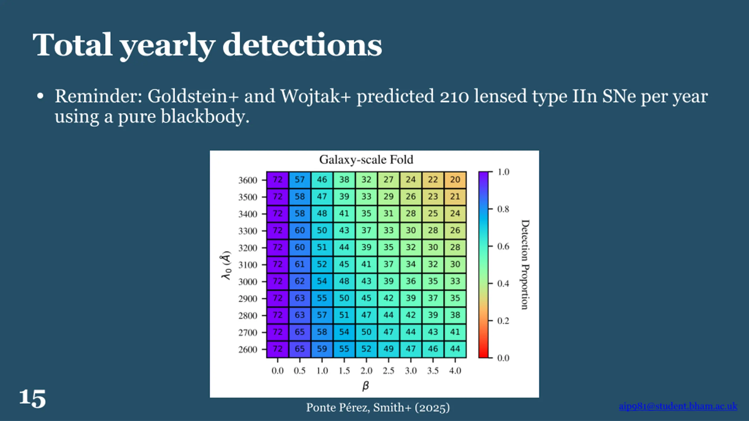 Total yearly detections Reminder: Goldstein+ and Wojtak+ predicted 210 lensed type IIn SNe per year using a pure blackbody. 15 aip981@student.bham.ac.uk Ponte P rez, Smith+ (2025)