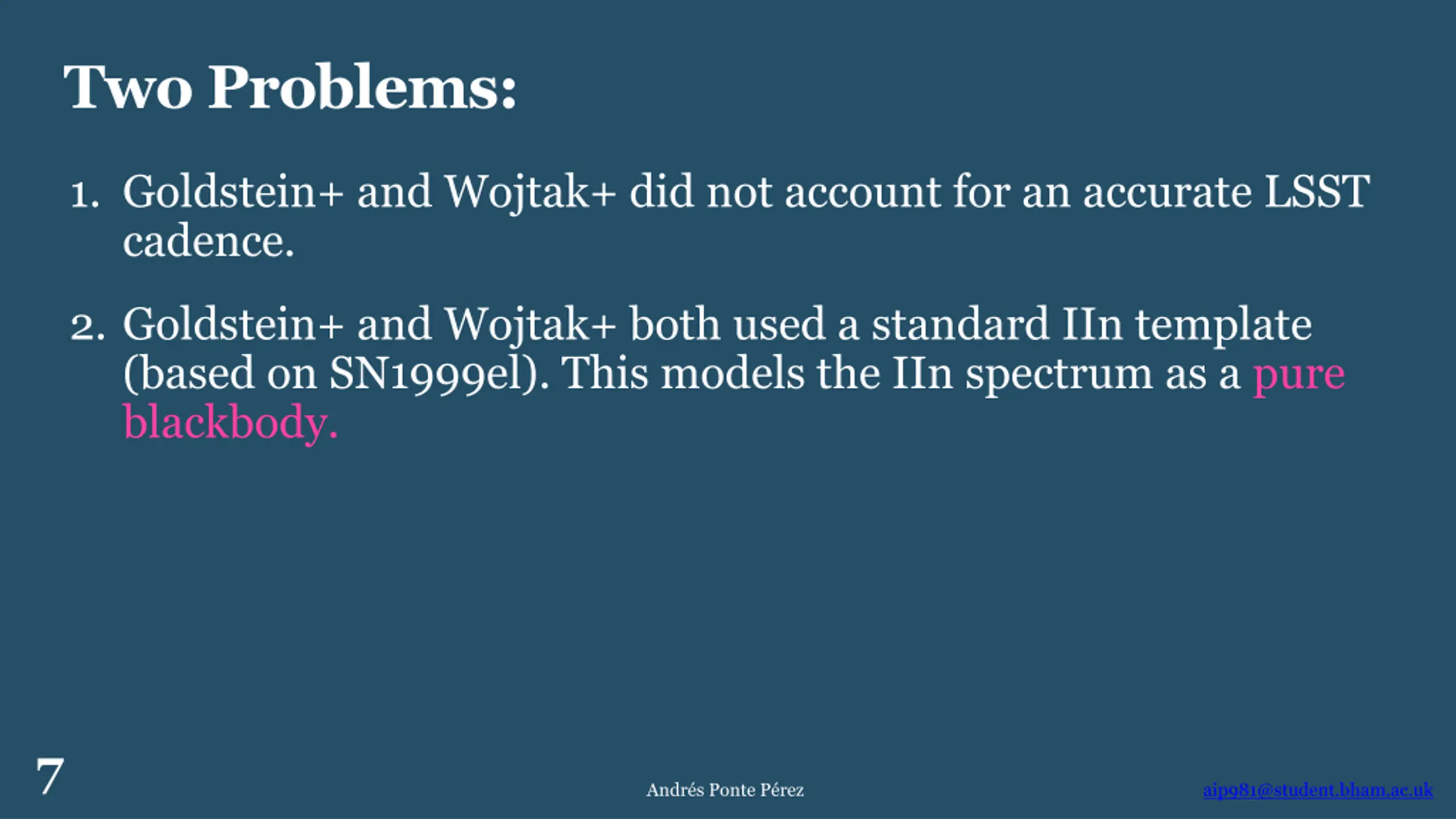 Two Problems: 1. Goldstein+ and Wojtak+ did not account for an accurate LSST cadence. 2. Goldstein+ and Wojtak+ both used a standard IIn template (based on SN1999el). This models the IIn spectrum as a pure blackbody. 7 Andr s Ponte P rez aip981@student.bham.ac.uk