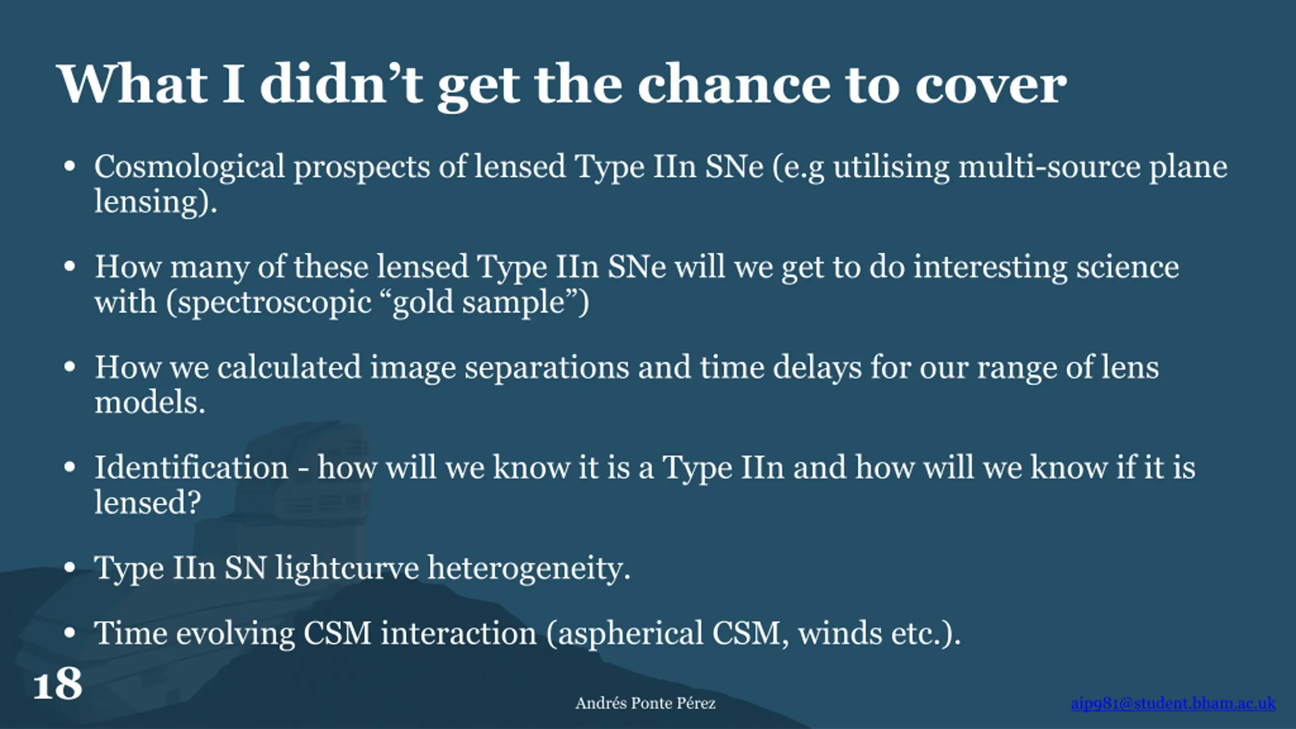 What I didnt get the chance to cover Cosmological prospects of lensed Type IIn SNe (e.g utilising multi-source plane lensing). How many of these lensed Type IIn SNe will we get to do interesting science with (spectroscopic gold sample ) How we calculated image separations and time delays for our range of lens models. Identification - how will we know it is a Type IIn and how will we know if it is lensed? Type IIn SN lightcurve heterogeneity. Time evolving CSM interaction (aspherical CSM, winds etc.). 18 Andr s Ponte P rez aip981@student.bham.ac.uk