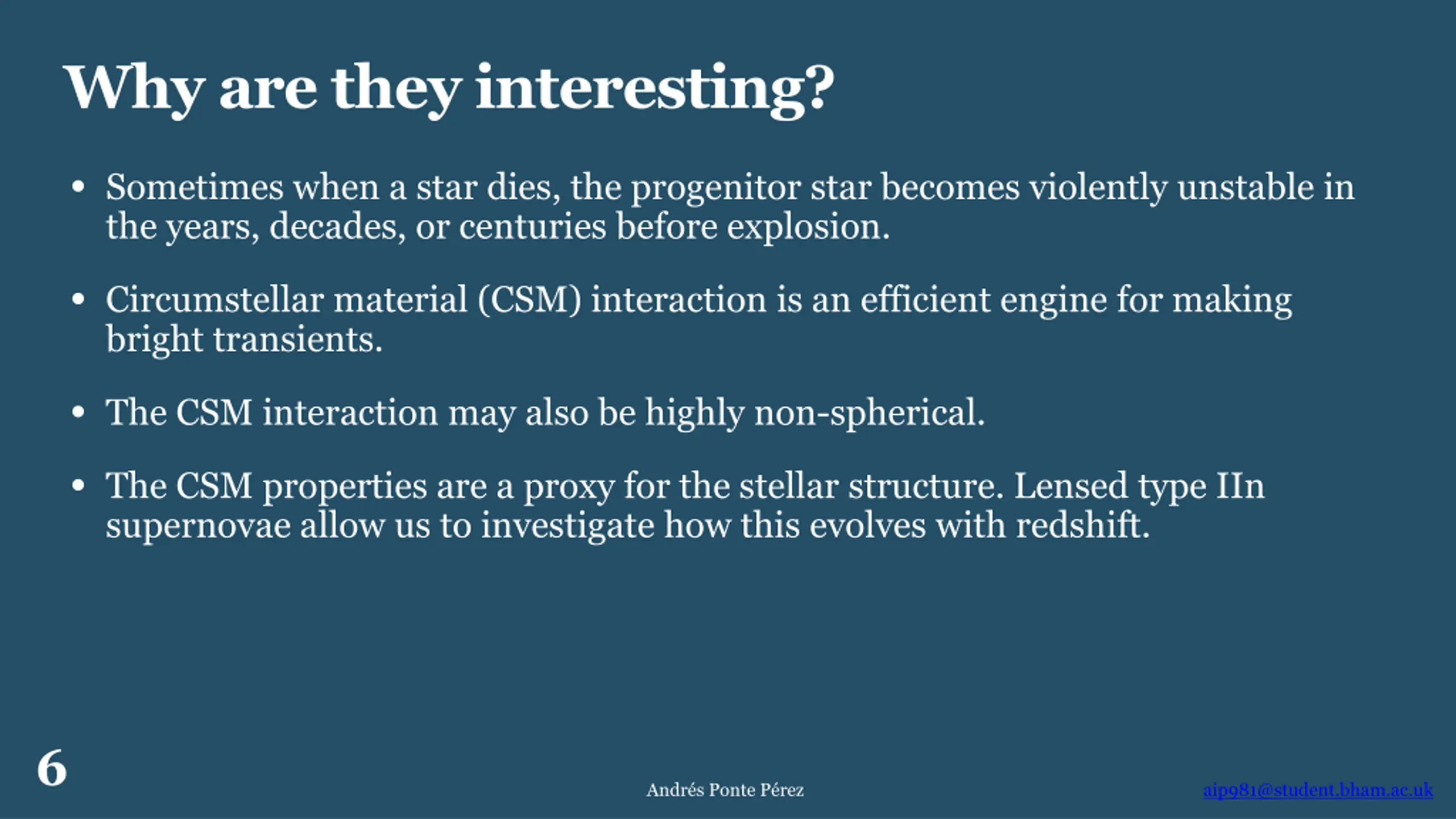 Why are they interesting? Sometimes when a star dies, the progenitor star becomes violently unstable in the years, decades, or centuries before explosion. Circumstellar material (CSM) interaction is an efficient engine for making bright transients. The CSM interaction may also be highly non-spherical. The CSM properties are a proxy for the stellar structure. Lensed type IIn supernovae allow us to investigate how this evolves with redshift. 6 Andr s Ponte P rez aip981@student.bham.ac.uk