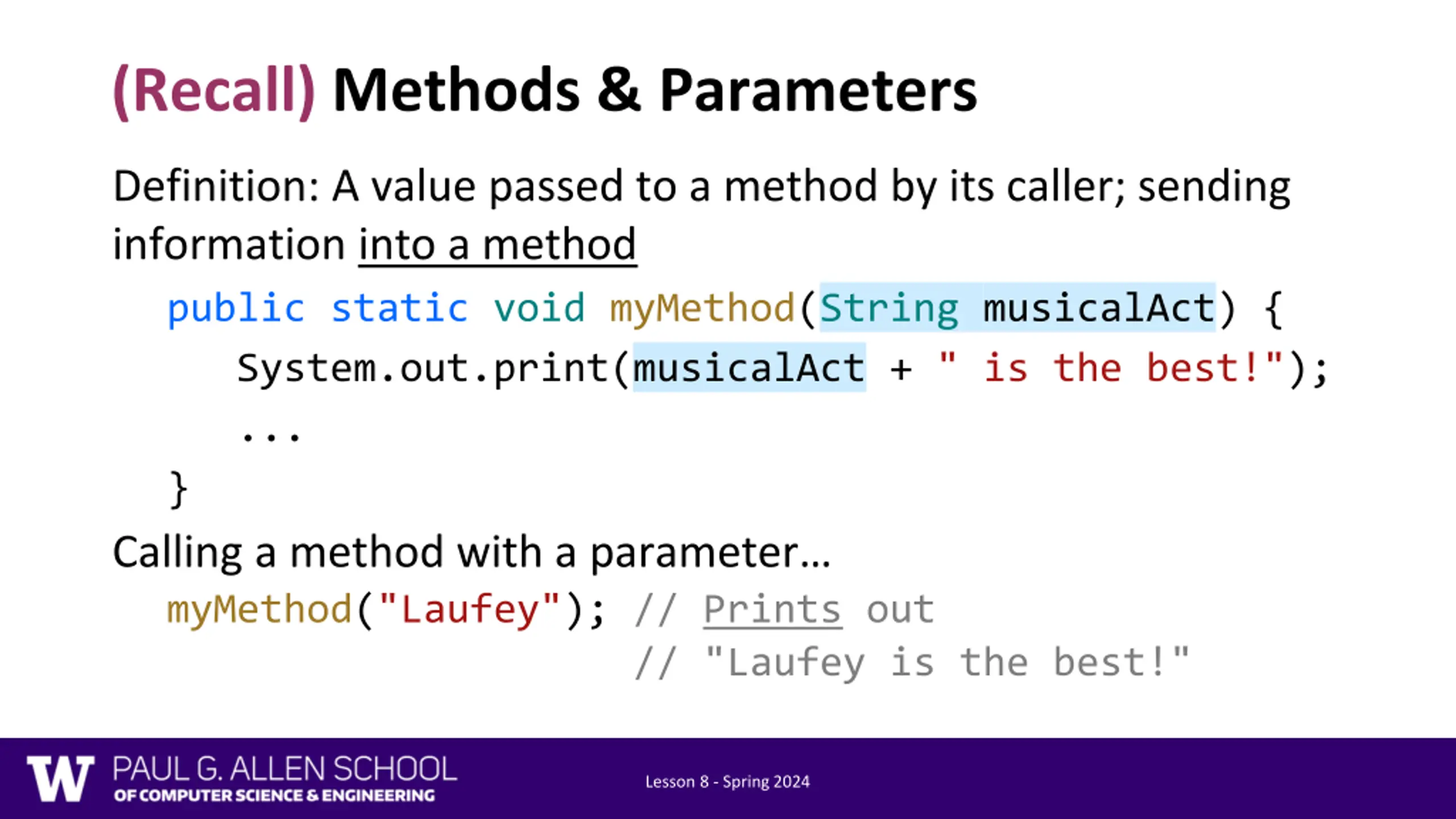 (Recall) Methods & Parameters Definition: A value passed to a method by its caller; sending information into a method public static void myMethod(String musicalAct) { System.out.print(musicalAct + " is the best!"); ... } Calling a method with a parameter myMethod("Laufey"); // Prints out // "Laufey is the best!" Lesson 8 - Spring 2024