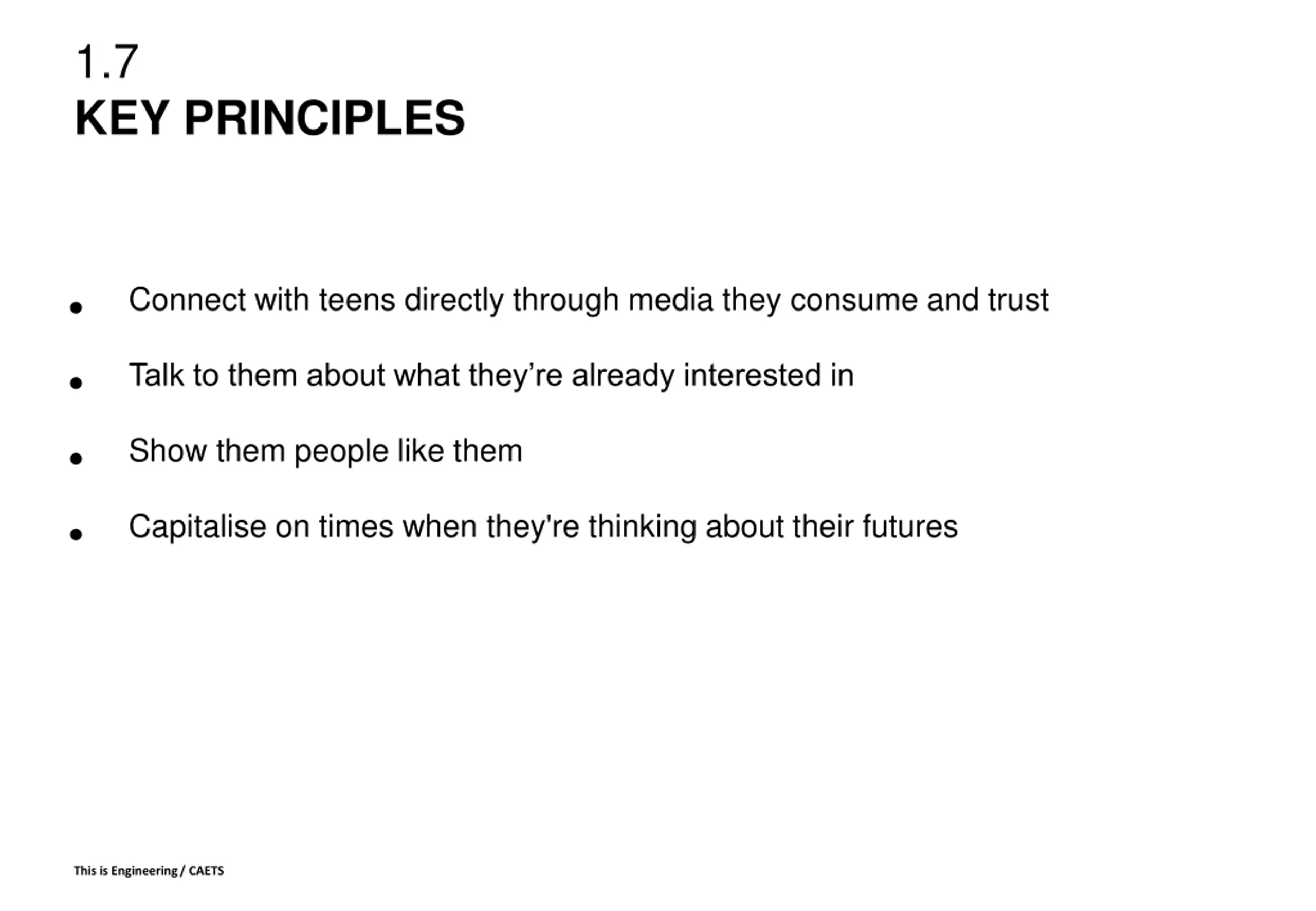 1.7 KEY PRINCIPLES Connect with teens directly through media they consume and trust Talk to them about what they re already interested in Show them people like them Capitalise on times when they're thinking about their futures This is Engineering / CAETS