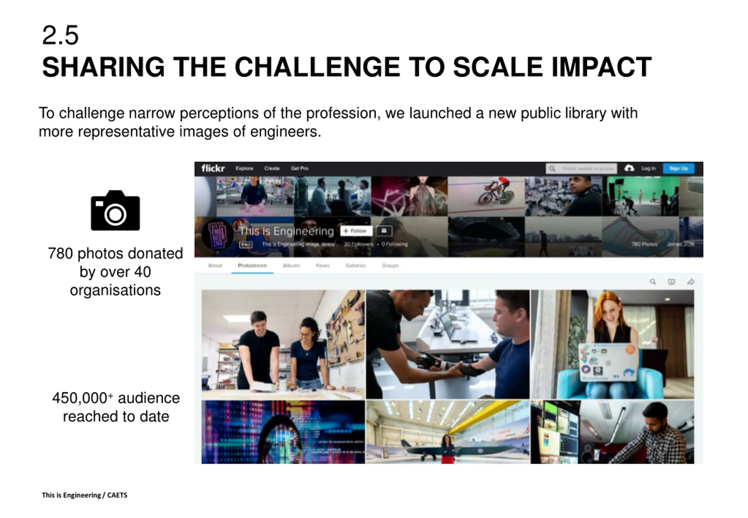 2.5 SHARING THE CHALLENGE TO SCALE IMPACT To challenge narrow perceptions of the profession, we launched a new public library with more representative images of engineers. 780 photos donated by over 40 organisations 450,000+ audience reached to date This is Engineering / CAETS