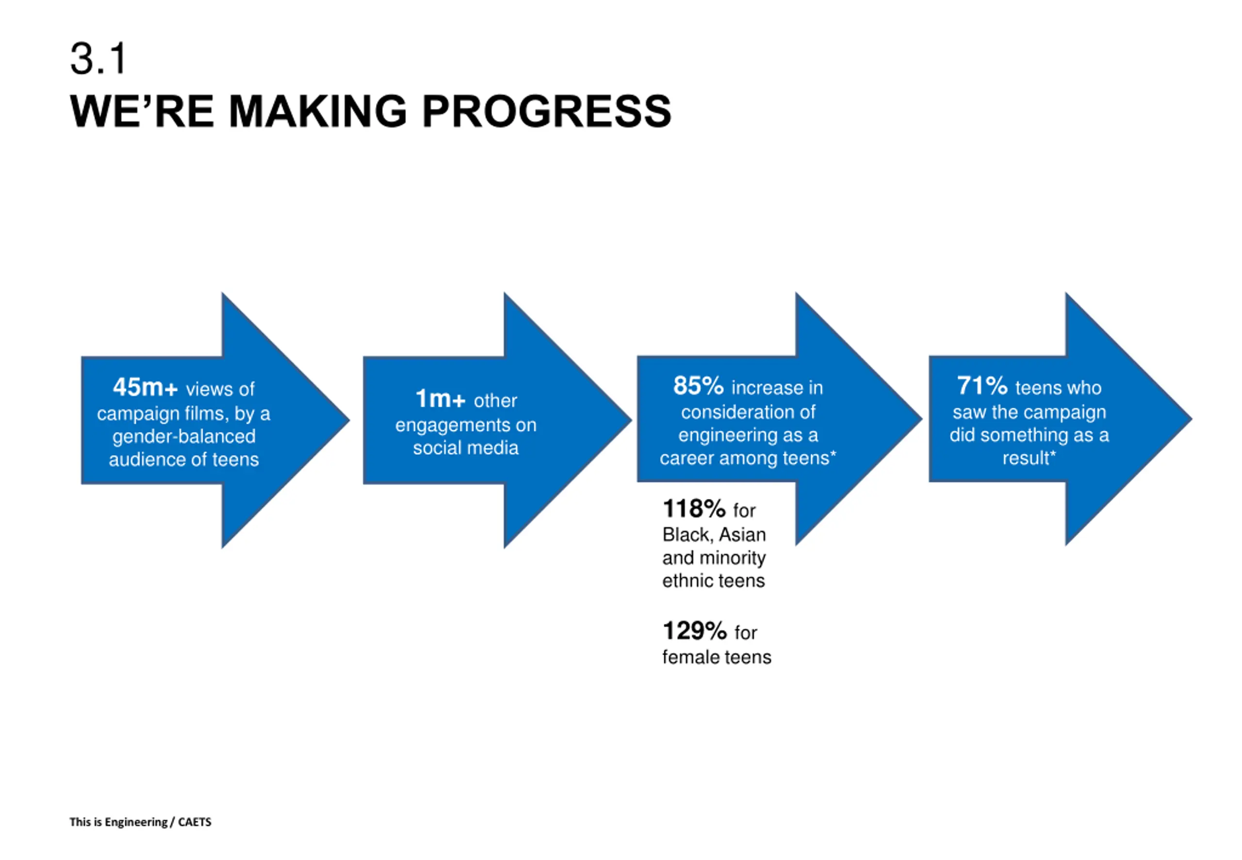 3.1 WE RE MAKING PROGRESS 85% increase in consideration of engineering as a career among teens* 71% teens who saw the campaign did something as a result* 45m+ views of campaign films, by a gender-balanced audience of teens 1m+ other engagements on social media 118% for Black, Asian and minority ethnic teens 129% for female teens This is Engineering / CAETS