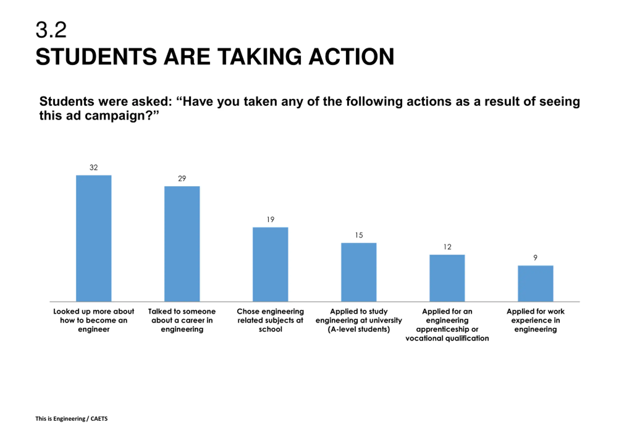 3.2 STUDENTS ARE TAKING ACTION Students were asked: Have you taken any of the following actions as a result of seeing this ad campaign? 32 29 19 15 12 9 Looked up more about how to become an engineer Talked to someone about a career in engineering Chose engineering related subjects at school Applied to study engineering at university (A-level students) Applied for an engineering apprenticeship or vocational qualification Applied for work experience in engineering This is Engineering / CAETS