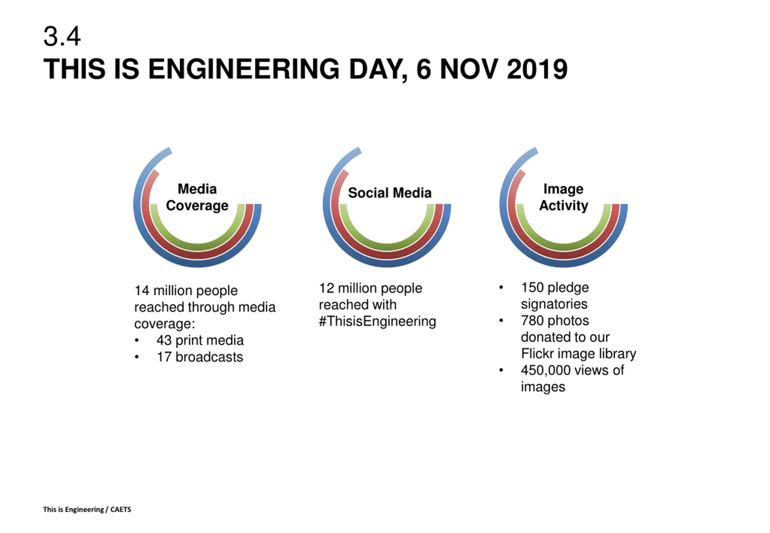 3.4 THIS IS ENGINEERING DAY, 6 NOV 2019 Media Coverage Image Activity Social Media 150 pledge signatories 780 photos donated to our Flickr image library 450,000 views of images 12 million people reached with #ThisisEngineering 14 million people reached through media coverage: 43 print media 17 broadcasts This is Engineering / CAETS