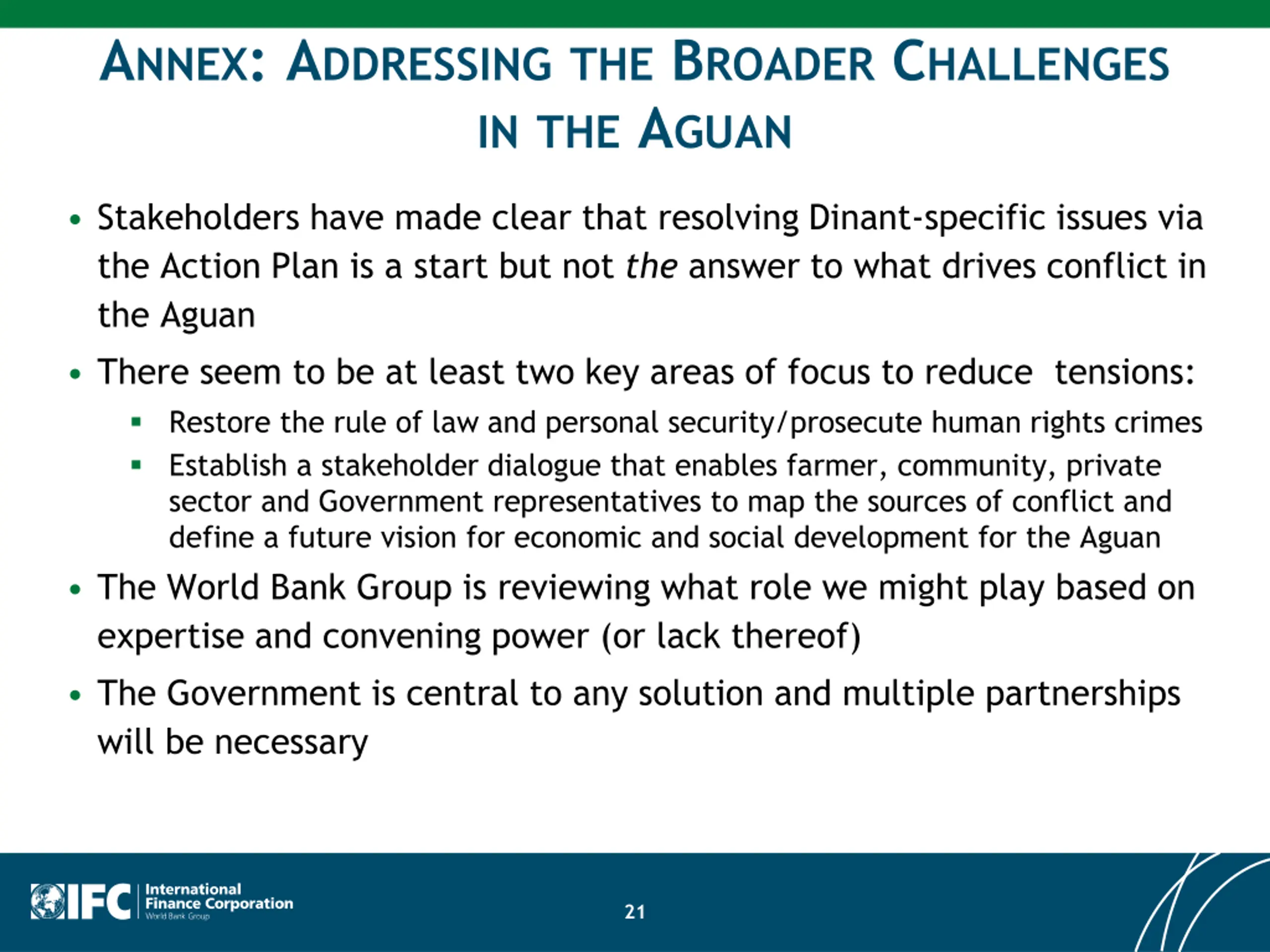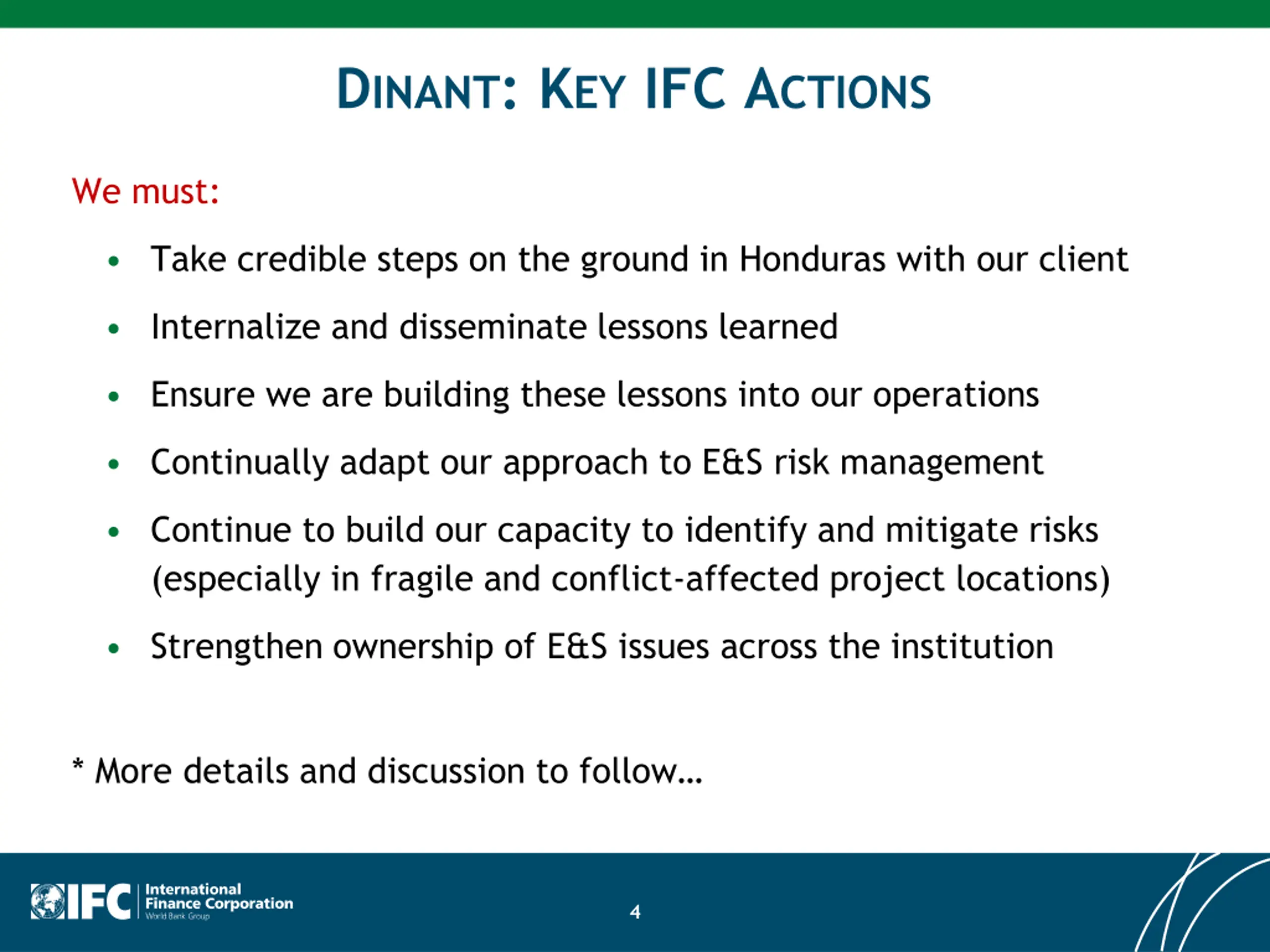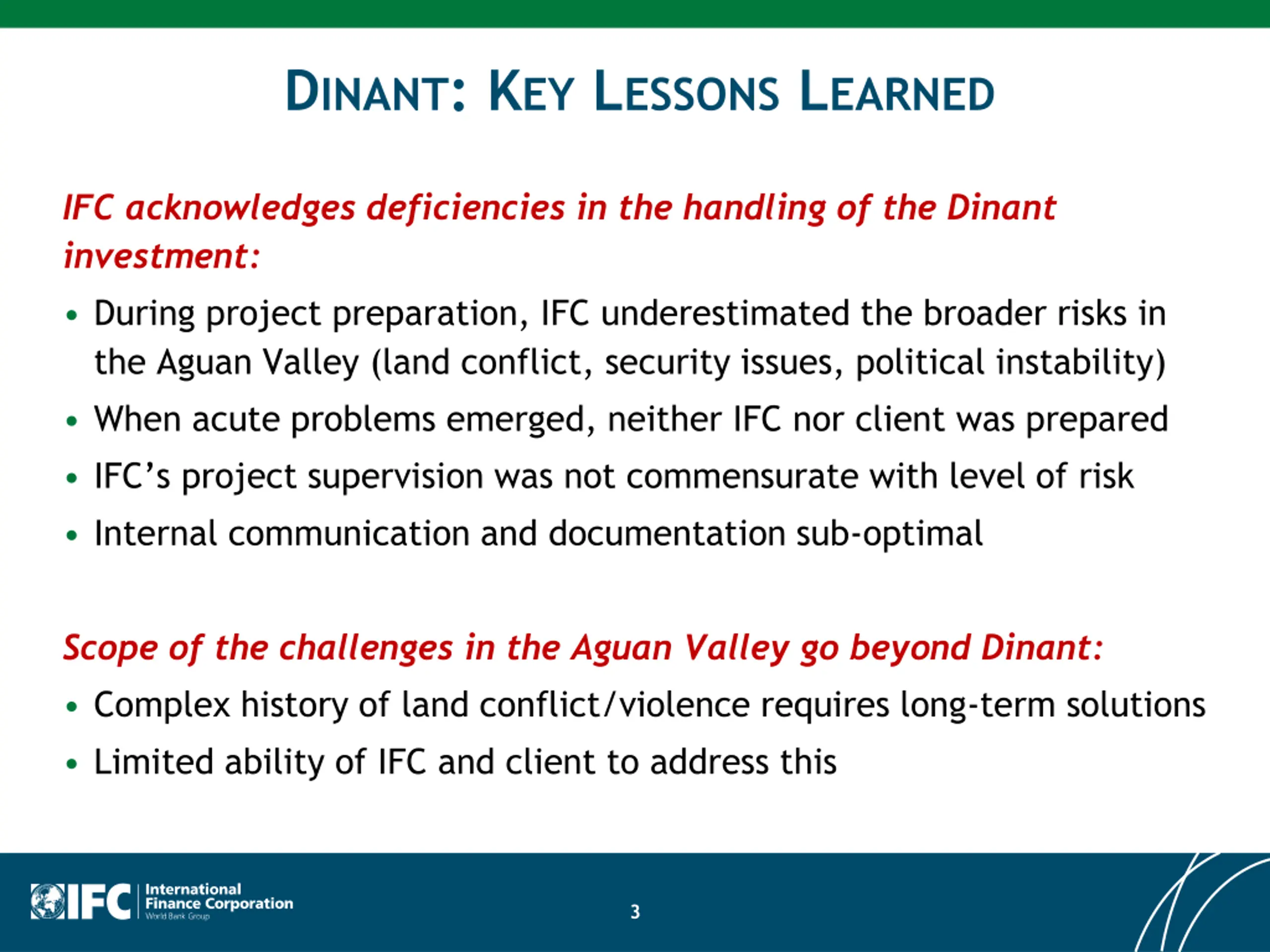 DINANT: KEY LESSONS LEARNED IFC acknowledges deficiencies in the handling of the Dinant investment: During project preparation, IFC underestimated the broader risks in the Aguan Valley (land conflict, security issues, political instability) When acute problems emerged, neither IFC nor client was prepared IFC s project supervision was not commensurate with level of risk Internal communication and documentation sub-optimal Scope of the challenges in the Aguan Valley go beyond Dinant: Complex history of land conflict/violence requires long-term solutions Limited ability of IFC and client to address this 3