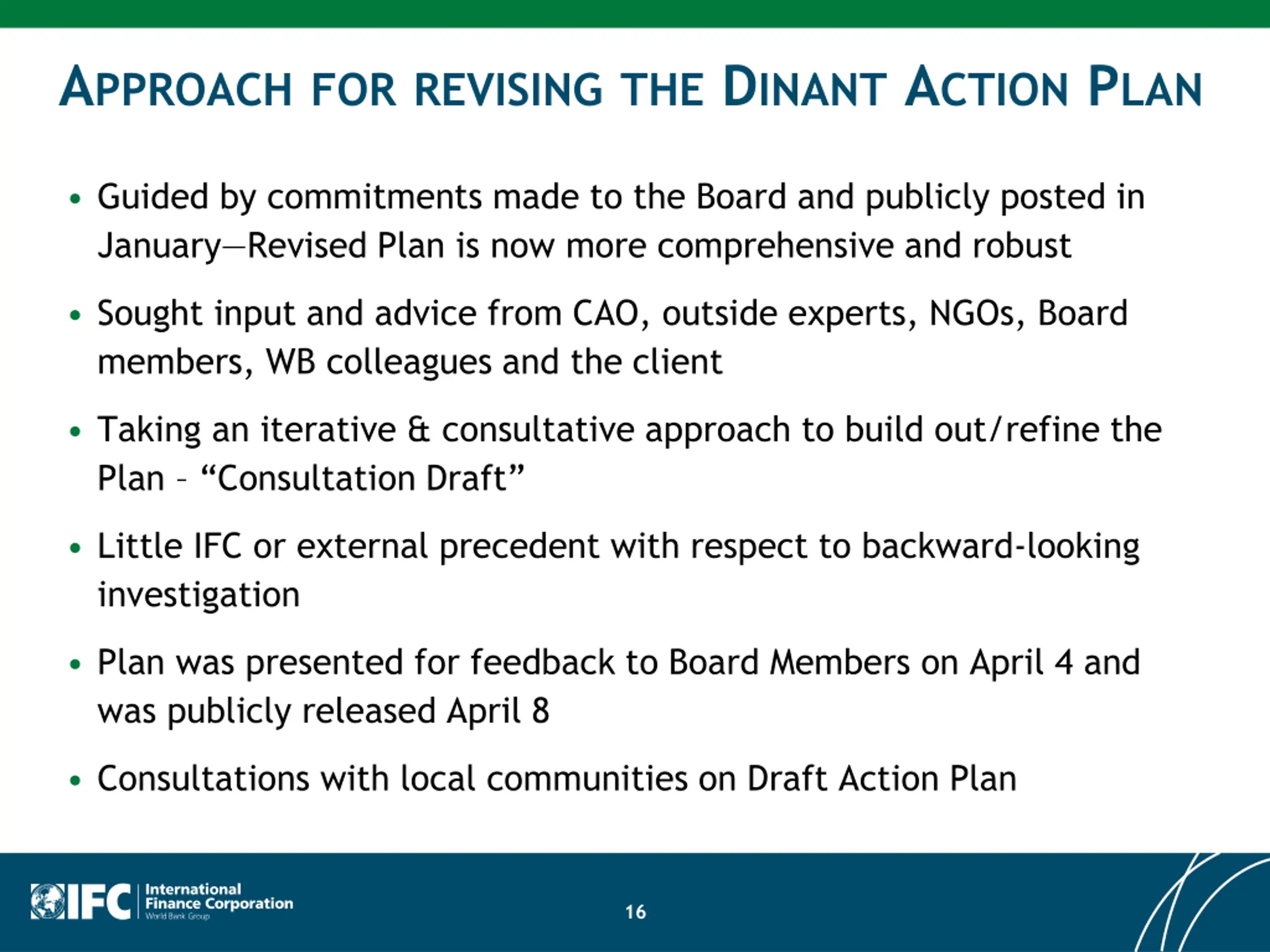APPROACHFORREVISINGTHE DINANT ACTION PLAN Guided by commitments made to the Board and publicly posted in January Revised Plan is now more comprehensive and robust Sought input and advice from CAO, outside experts, NGOs, Board members, WB colleagues and the client Taking an iterative & consultative approach to build out/refine the Plan Consultation Draft Little IFC or external precedent with respect to backward-looking investigation Plan was presented for feedback to Board Members on April 4 and was publicly released April 8 Consultations with local communities on Draft Action Plan 16