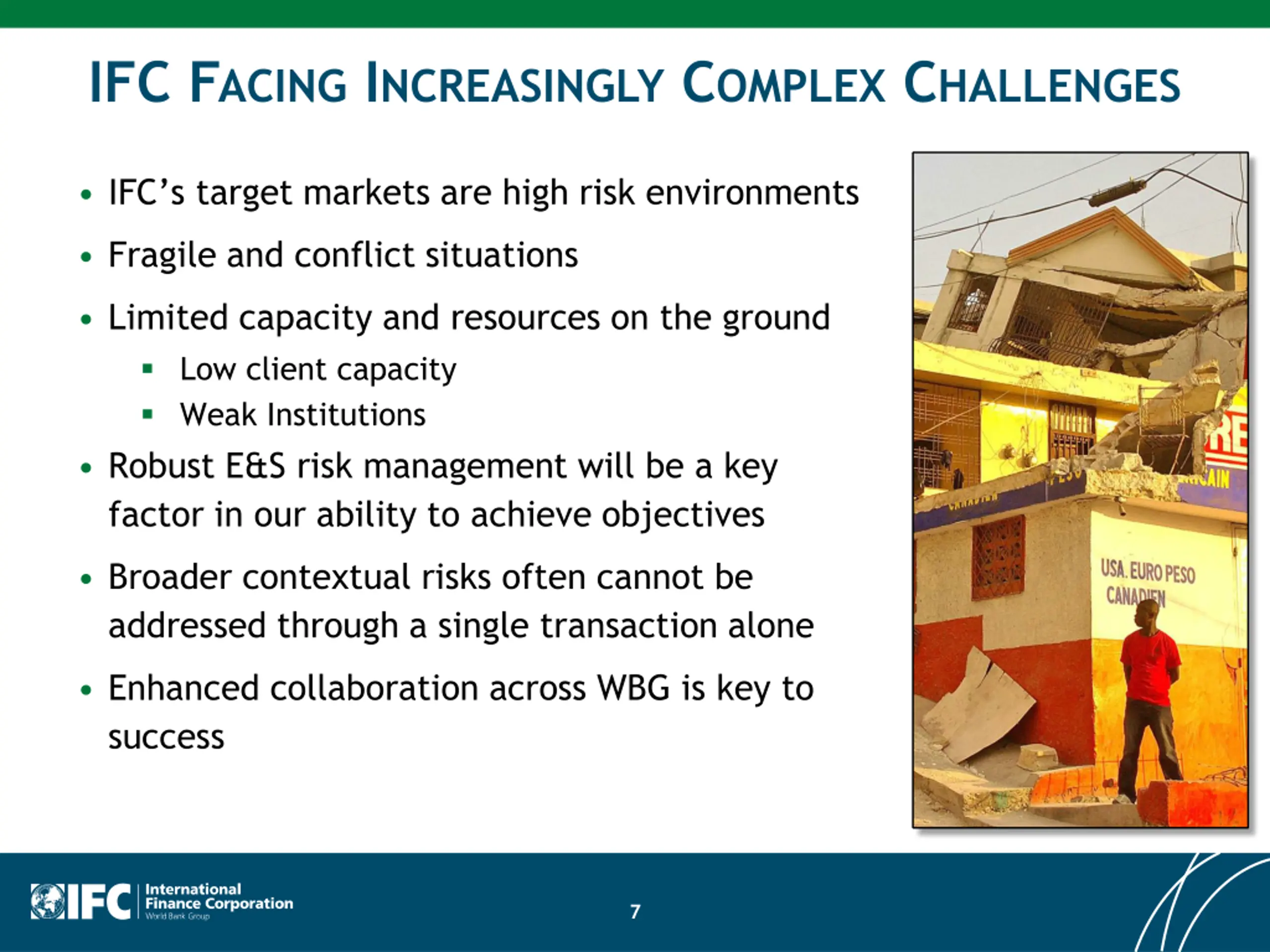 IFC FACING INCREASINGLY COMPLEX CHALLENGES IFC s target markets are high risk environments Fragile and conflict situations Limited capacity and resources on the ground Low client capacity Weak Institutions Robust E&S risk management will be a key factor in our ability to achieve objectives Broader contextual risks often cannot be addressed through a single transaction alone Enhanced collaboration across WBG is key to success 7