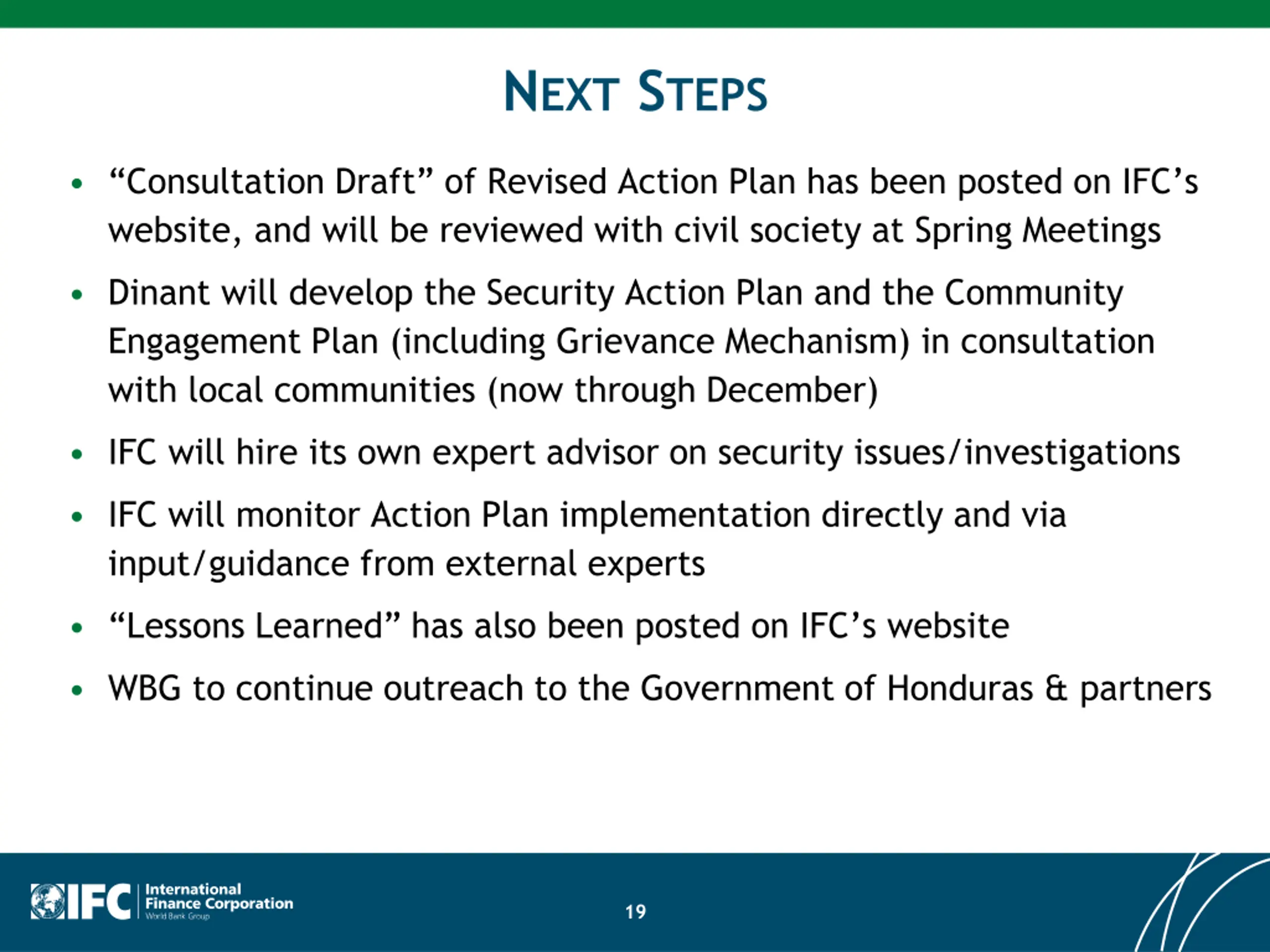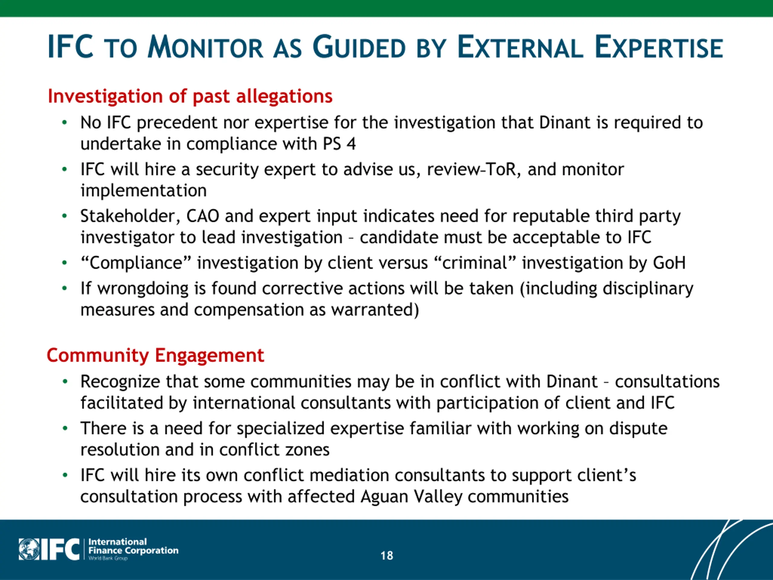 IFC TO MONITORAS GUIDEDBY EXTERNAL EXPERTISE Investigation of past allegations No IFC precedent nor expertise for the investigation that Dinant is required to undertake in compliance with PS 4 IFC will hire a security expert to advise us, review ToR, and monitor implementation Stakeholder, CAO and expert input indicates need for reputable third party investigator to lead investigation candidate must be acceptable to IFC Compliance investigation by client versus criminal investigation by GoH If wrongdoing is found corrective actions will be taken (including disciplinary measures and compensation as warranted) Community Engagement Recognize that some communities may be in conflict with Dinant consultations facilitated by international consultants with participation of client and IFC There is a need for specialized expertise familiar with working on dispute resolution and in conflict zones IFC will hire its own conflict mediation consultants to support client s consultation process with affected Aguan Valley communities 18
