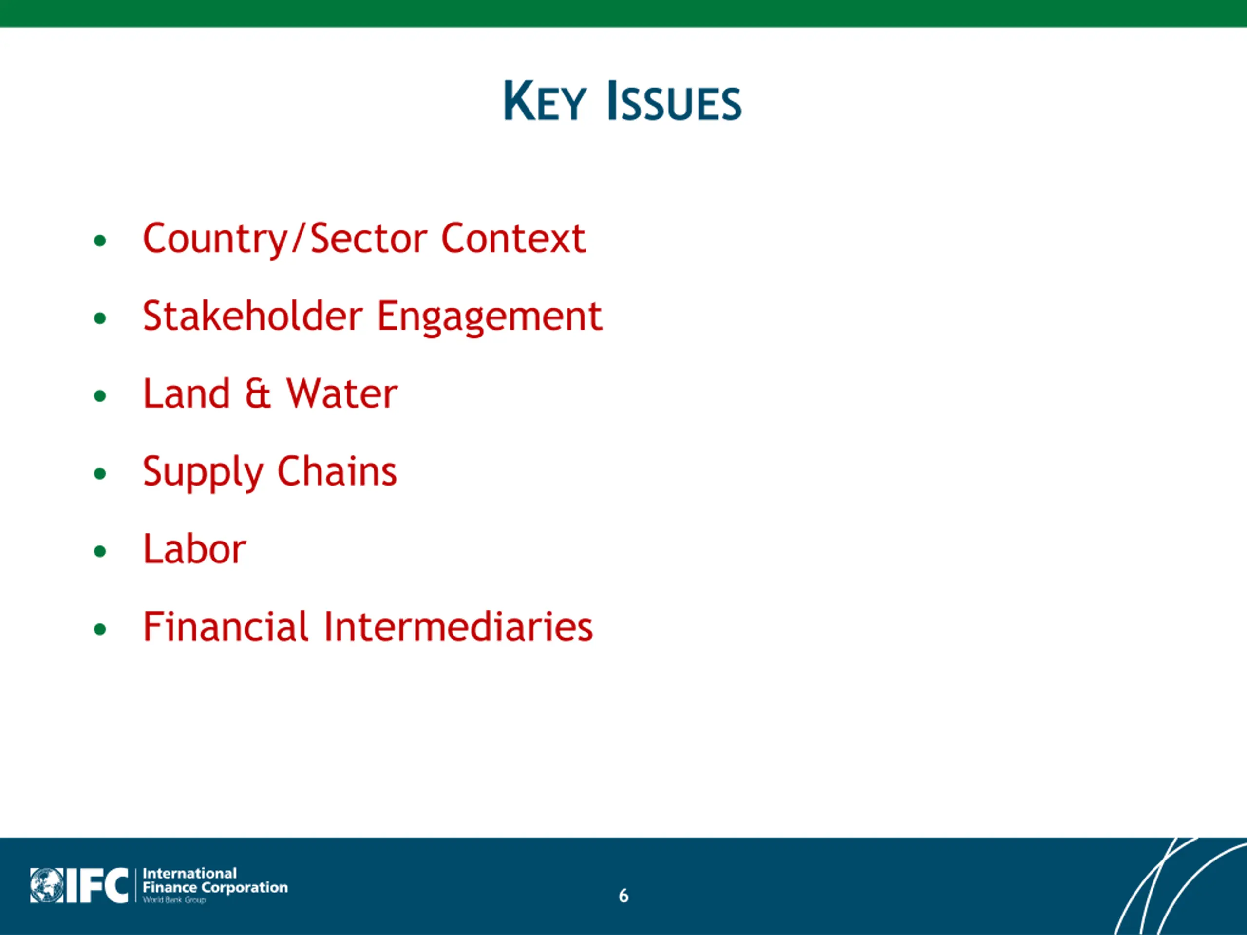 KEY ISSUES Country/Sector Context Stakeholder Engagement Land & Water Supply Chains Labor Financial Intermediaries 6
