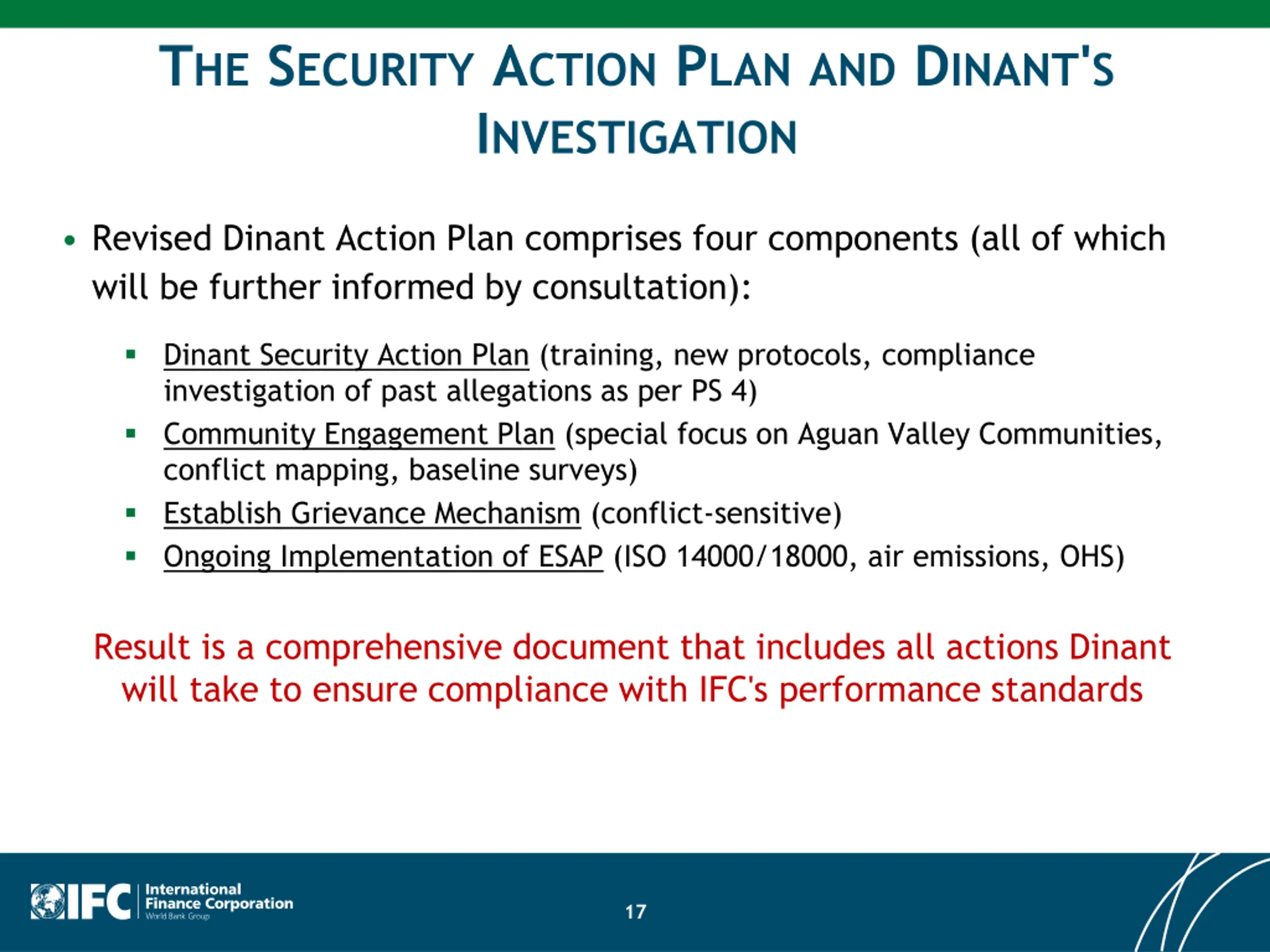 THE SECURITY ACTION PLANAND DINANT'S INVESTIGATION Revised Dinant Action Plan comprises four components (all of which will be further informed by consultation): Dinant Security Action Plan (training, new protocols, compliance investigation of past allegations as per PS 4) Community Engagement Plan (special focus on Aguan Valley Communities, conflict mapping, baseline surveys) Establish Grievance Mechanism (conflict-sensitive) Ongoing Implementation of ESAP (ISO 14000/18000, air emissions, OHS) Result is a comprehensive document that includes all actions Dinant will take to ensure compliance with IFC's performance standards 17
