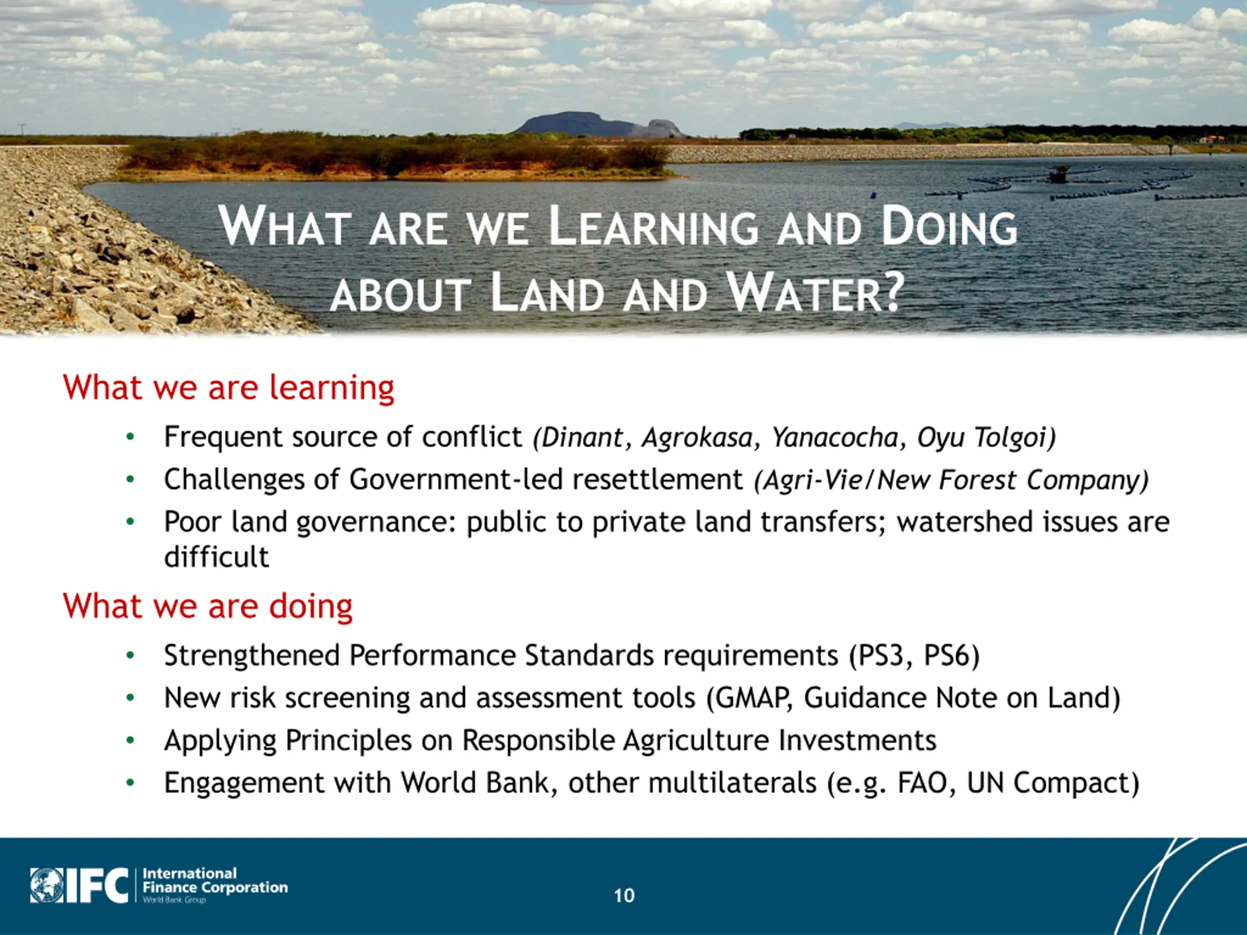 WHATAREWE LEARNINGAND DOING ABOUT LANDAND WATER? What we are learning Frequent source of conflict (Dinant, Agrokasa, Yanacocha, Oyu Tolgoi) Challenges of Government-led resettlement (Agri-Vie/New Forest Company) Poor land governance: public to private land transfers; watershed issues are difficult What we are doing Strengthened Performance Standards requirements (PS3, PS6) New risk screening and assessment tools (GMAP, Guidance Note on Land) Applying Principles on Responsible Agriculture Investments Engagement with World Bank, other multilaterals (e.g. FAO, UN Compact) 10