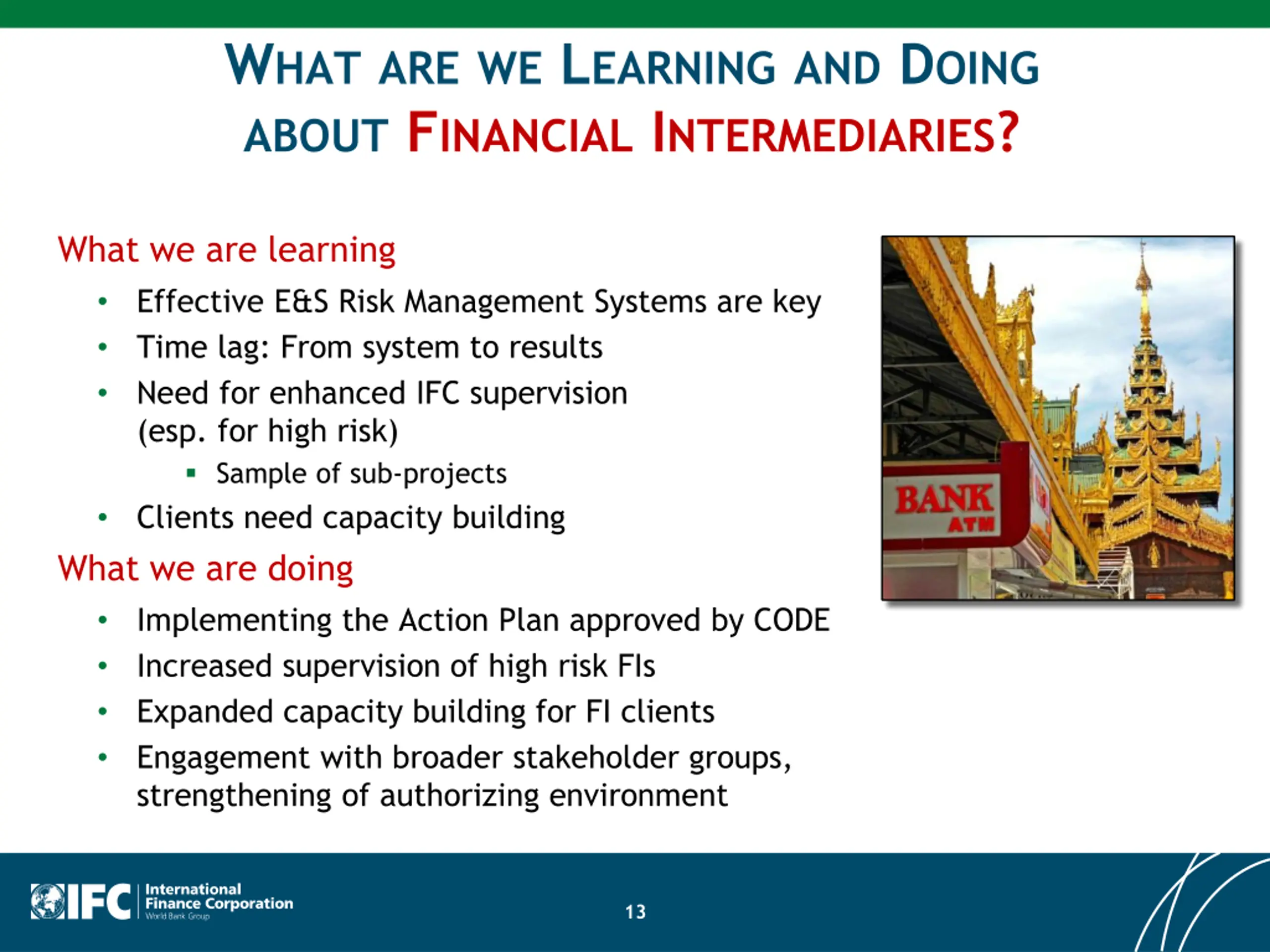 WHATAREWE LEARNINGAND DOING ABOUT FINANCIAL INTERMEDIARIES? What we are learning Effective E&S Risk Management Systems are key Time lag: From system to results Need for enhanced IFC supervision (esp. for high risk) Sample of sub-projects Clients need capacity building What we are doing Implementing the Action Plan approved by CODE Increased supervision of high risk FIs Expanded capacity building for FI clients Engagement with broader stakeholder groups, strengthening of authorizing environment 13