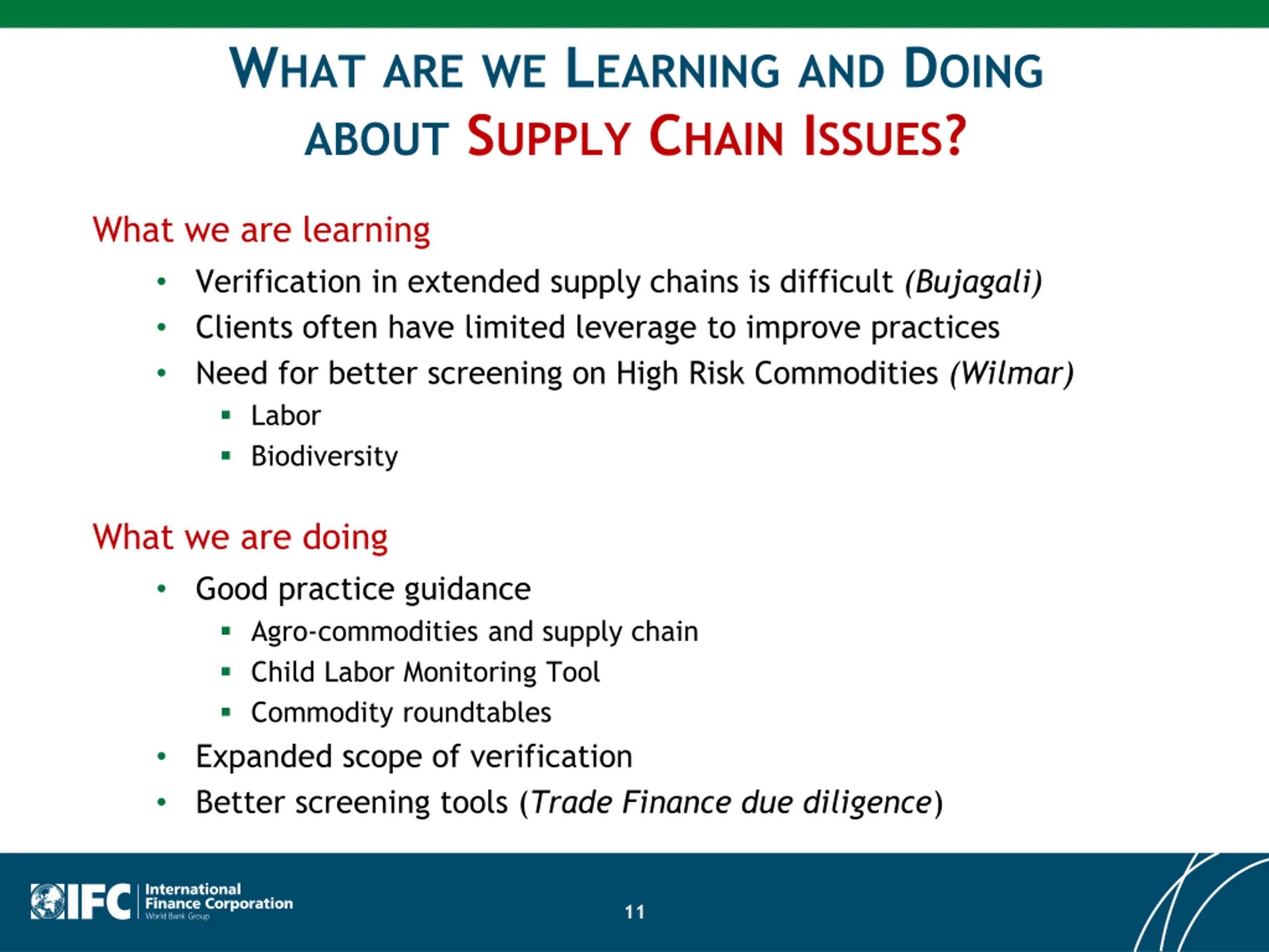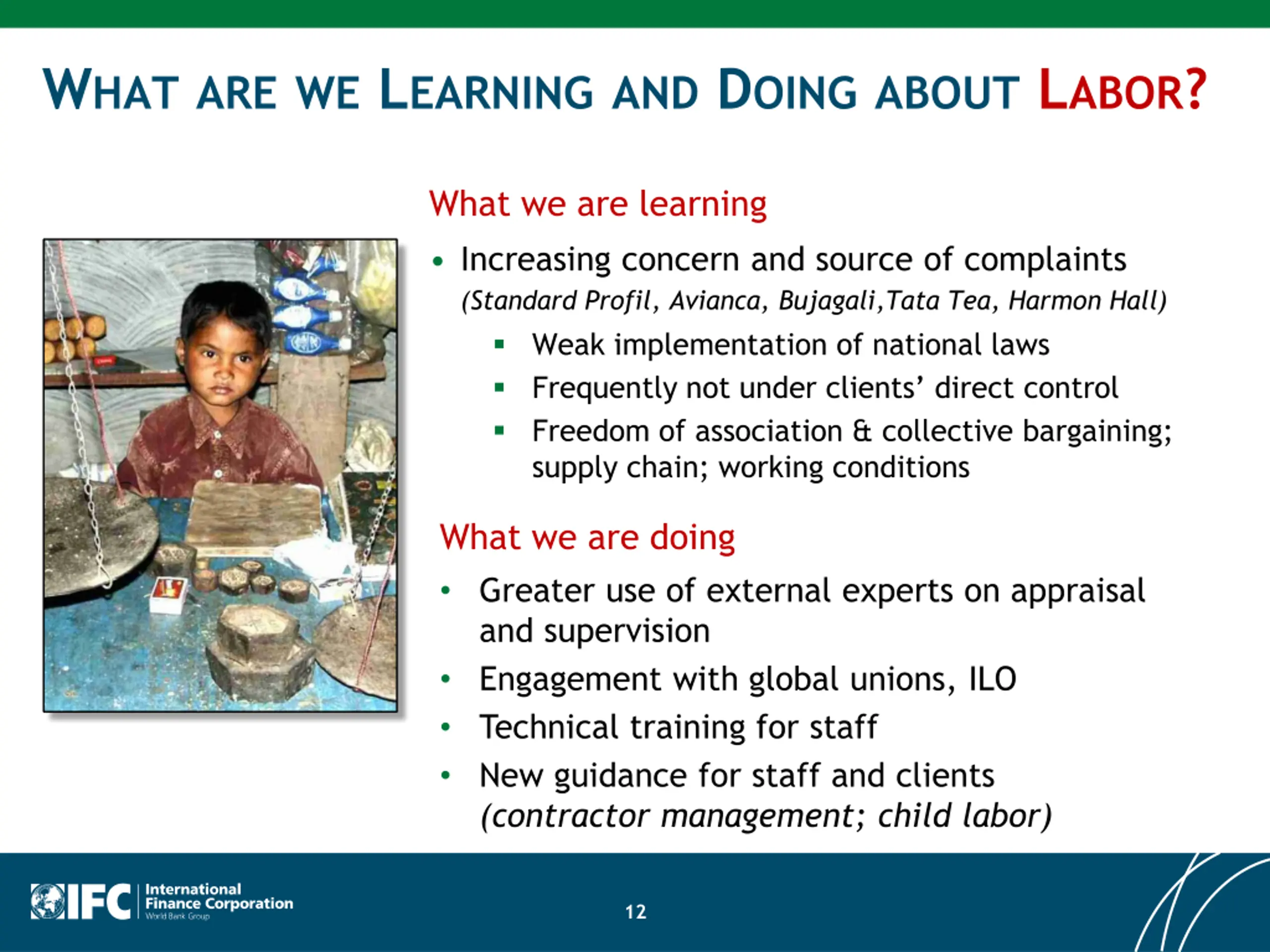 WHATAREWE LEARNINGAND DOING ABOUT SUPPLY CHAIN ISSUES? What we are learning Verification in extended supply chains is difficult (Bujagali) Clients often have limited leverage to improve practices Need for better screening on High Risk Commodities (Wilmar) Labor Biodiversity What we are doing Good practice guidance Agro-commodities and supply chain Child Labor Monitoring Tool Commodity roundtables Expanded scope of verification Better screening tools (Trade Finance due diligence) 11