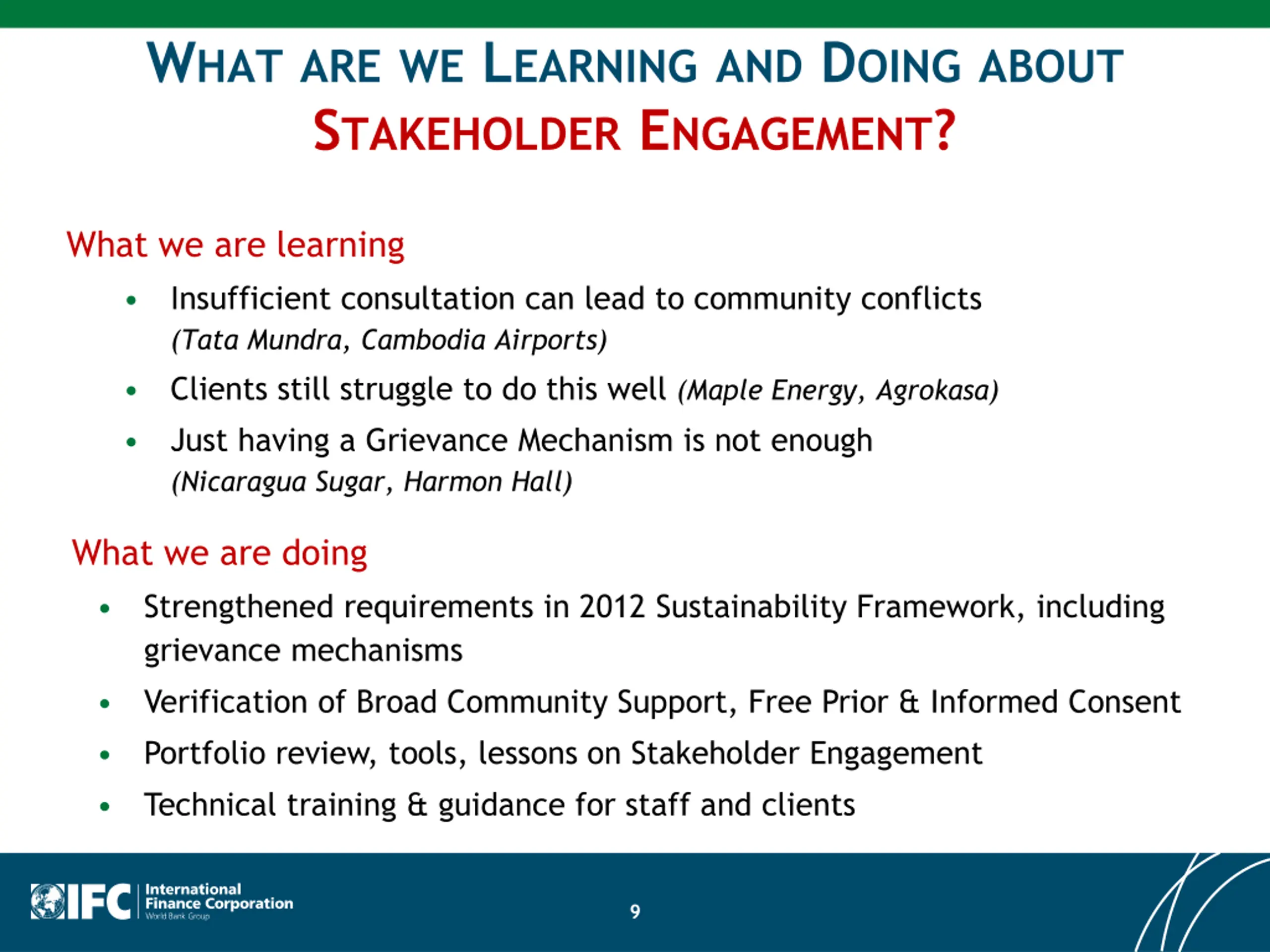 WHATAREWE LEARNINGAND DOINGABOUT STAKEHOLDER ENGAGEMENT? What we are learning Insufficient consultation can lead to community conflicts (Tata Mundra, Cambodia Airports) Clients still struggle to do this well (Maple Energy, Agrokasa) Just having a Grievance Mechanism is not enough (Nicaragua Sugar, Harmon Hall) What we are doing Strengthened requirements in 2012 Sustainability Framework, including grievance mechanisms Verification of Broad Community Support, Free Prior & Informed Consent Portfolio review, tools, lessons on Stakeholder Engagement Technical training & guidance for staff and clients 9