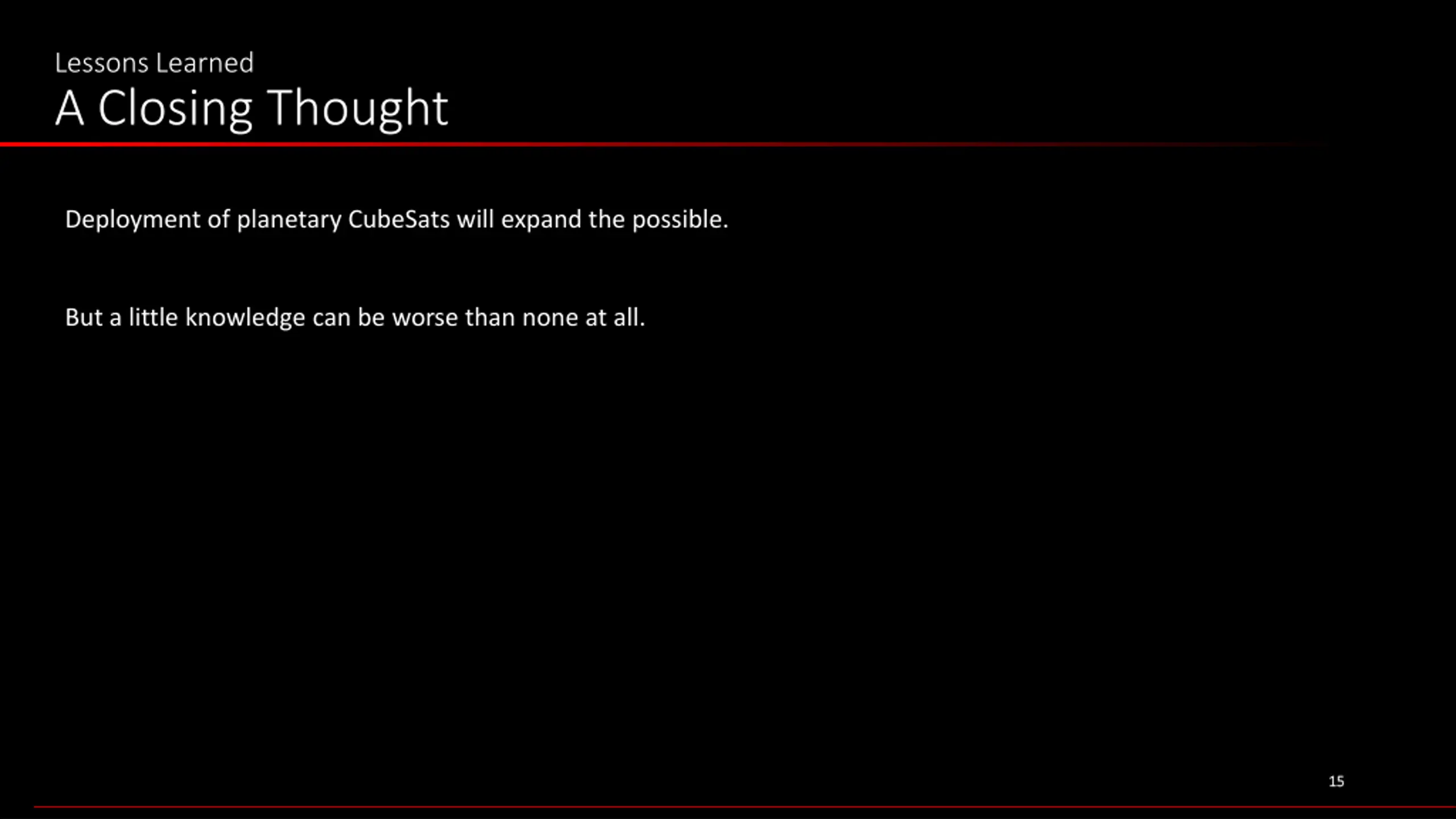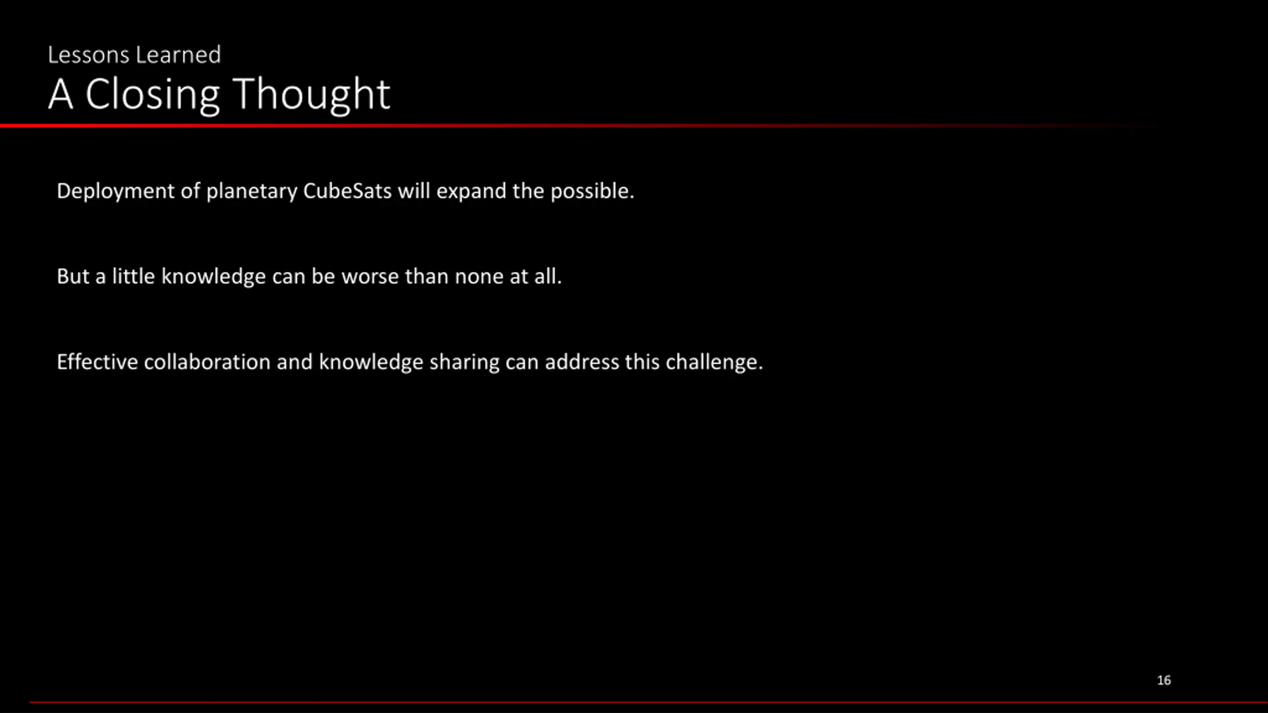 Lessons Learned A Closing Thought Deployment of planetary CubeSats will expand the possible. But a little knowledge can be worse than none at all. 15 15
