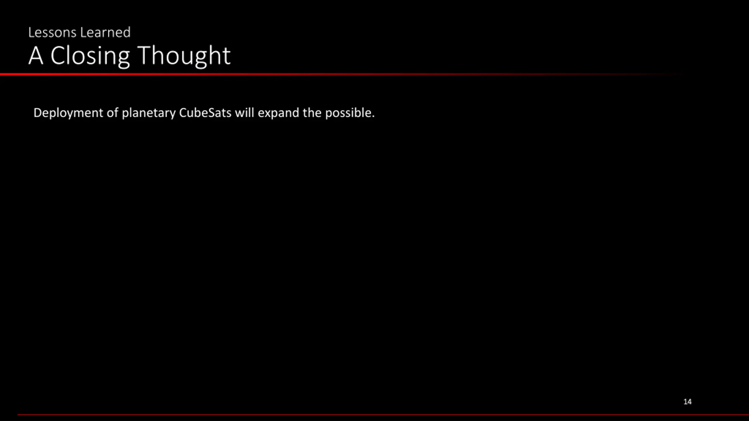 Lessons Learned A Closing Thought Deployment of planetary CubeSats will expand the possible. 14 14