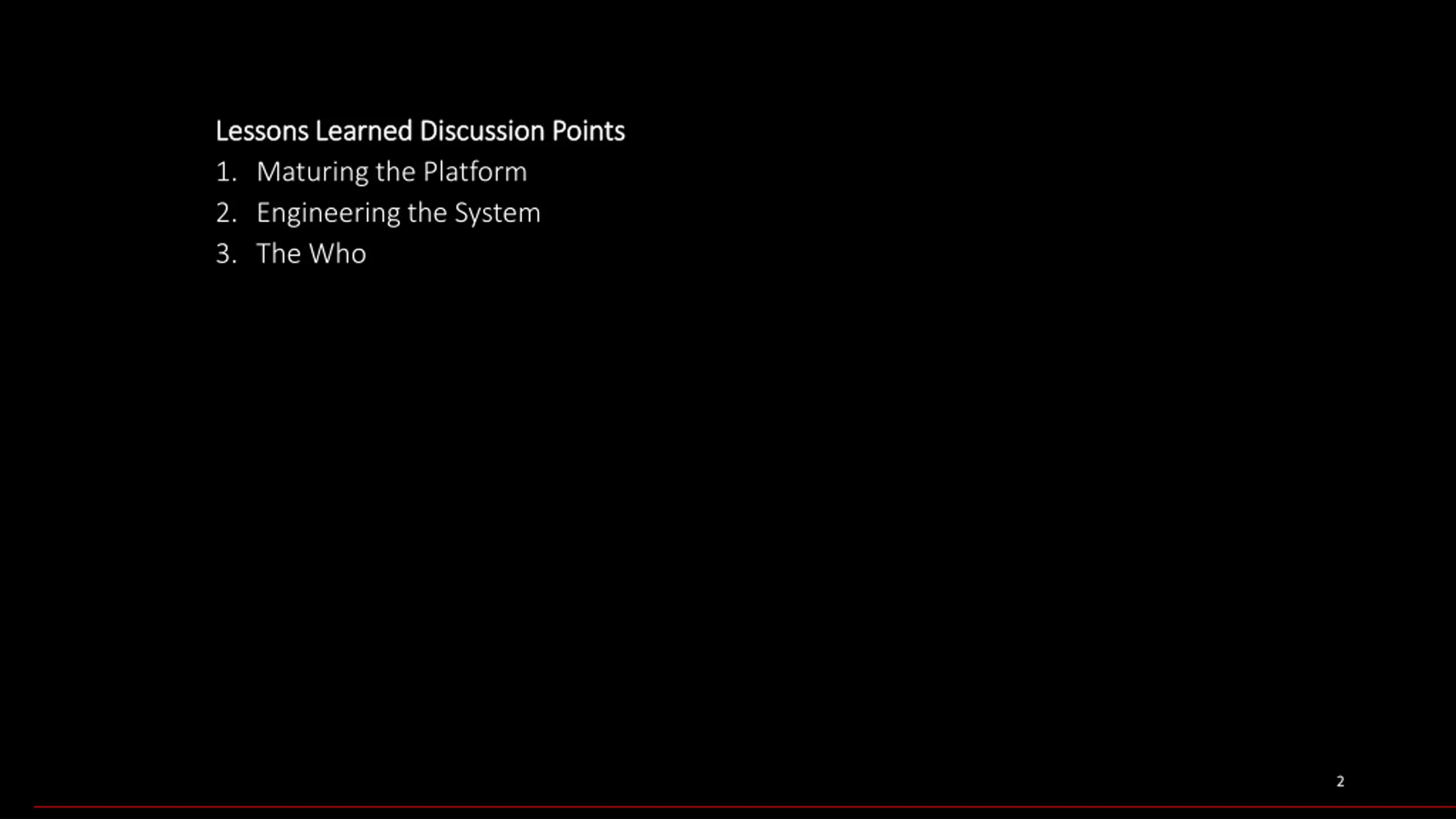 Lessons Learned Discussion Points Lessons Learned Discussion Points 1. Maturing the Platform 2. Engineering the System 3. The Who 2 2