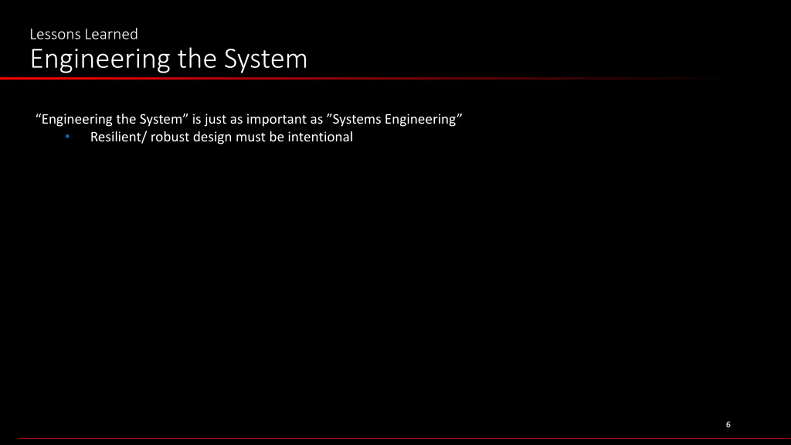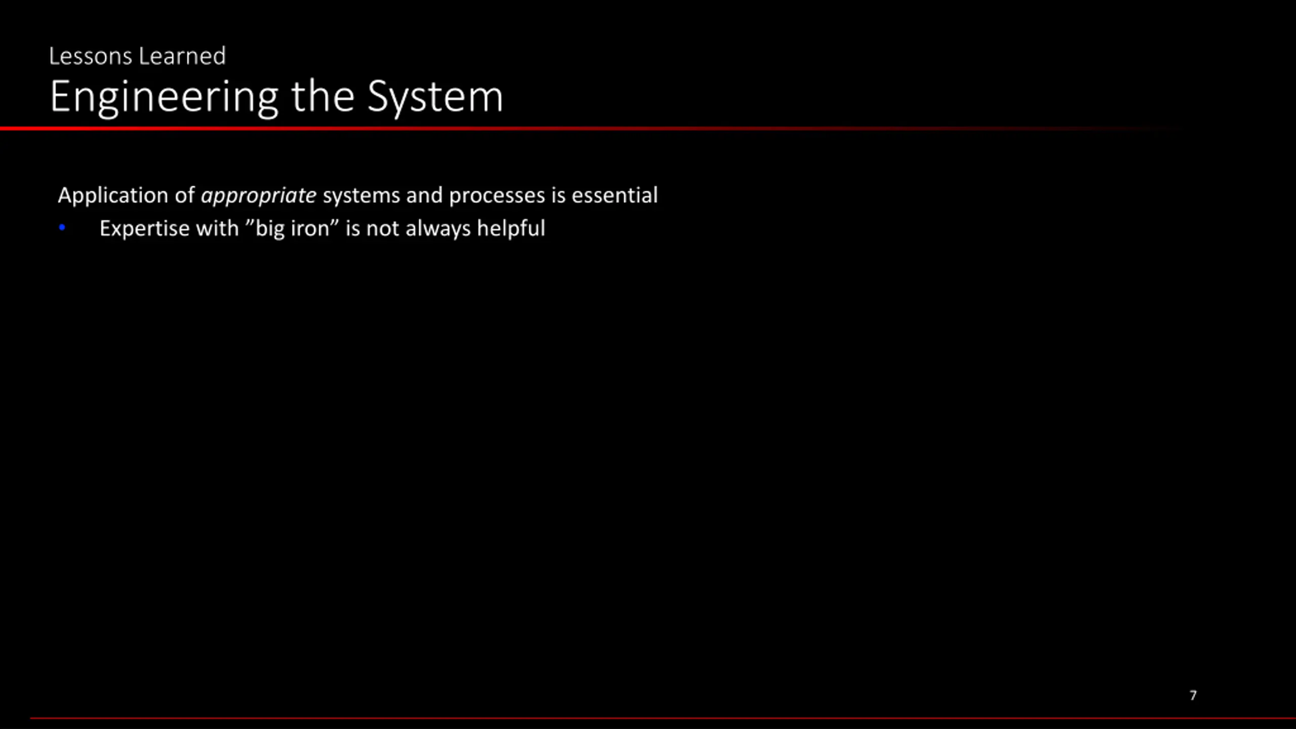 Lessons Learned Engineering the System Engineering the System is just as important as Systems Engineering Resilient/ robust design must be intentional 6 6