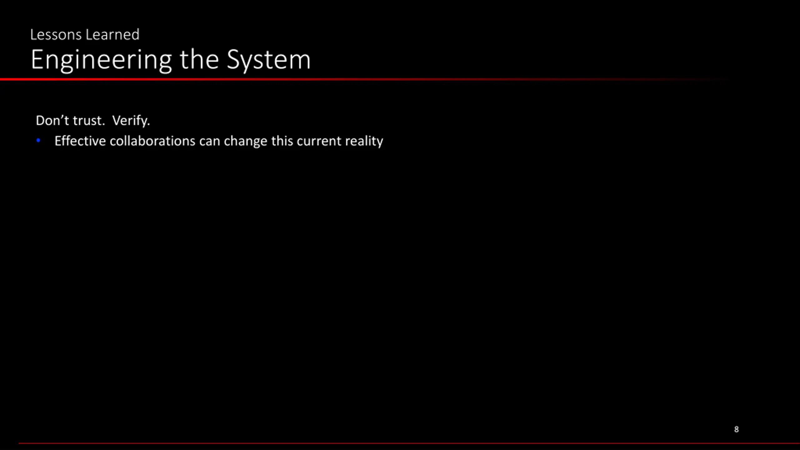Lessons Learned Engineering the System Don t trust. Verify. Effective collaborations can change this current reality 8 8