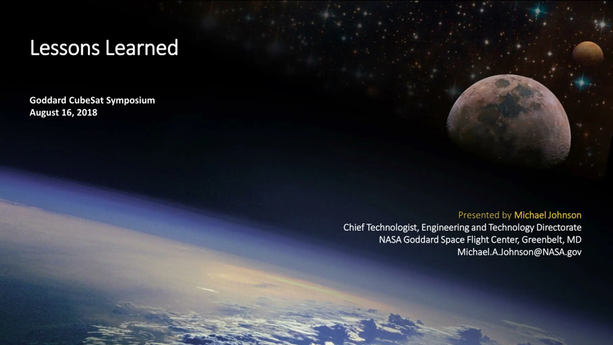 Lessons Learned Lessons Learned Goddard CubeSat Symposium August 16, 2018 Presented by Michael Johnson Michael Johnson Chief Technologist, Engineering and Technology Directorate Chief Technologist, Engineering and Technology Directorate NASA Goddard Space Flight Center, Greenbelt, MD NASA Goddard Space Flight Center, Greenbelt, MD Michael.A.Johnson@NASA.gov Michael.A.Johnson@NASA.gov