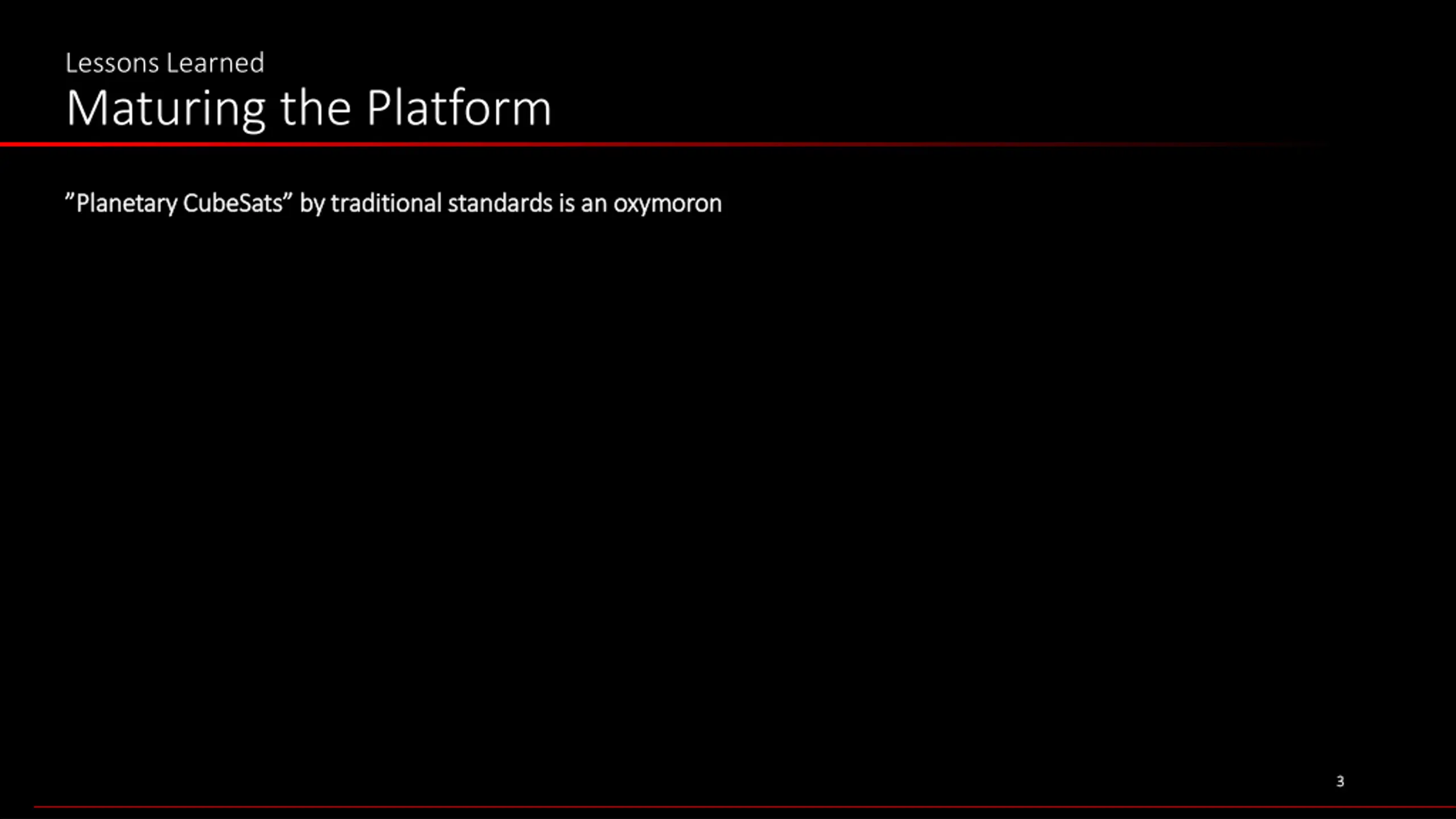 Lessons Learned Maturing the Platform Planetary CubeSats by traditional standards is an oxymoron Planetary CubeSats by traditional standards is an oxymoron 3 3