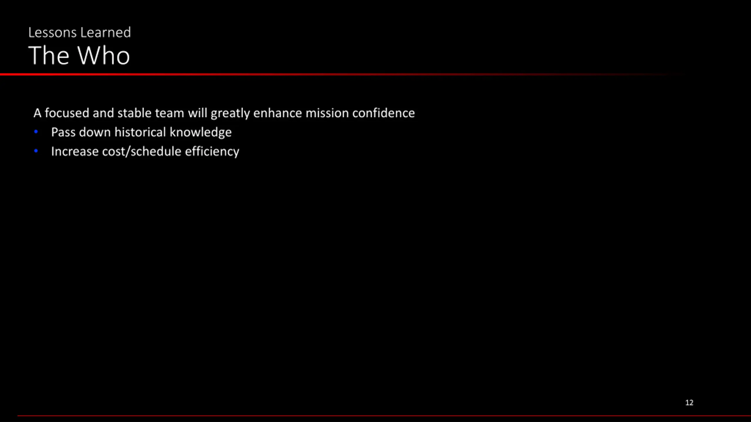 Lessons Learned The Who A focused and stable team will greatly enhance mission confidence Pass down historical knowledge Increase cost/schedule efficiency 12 12