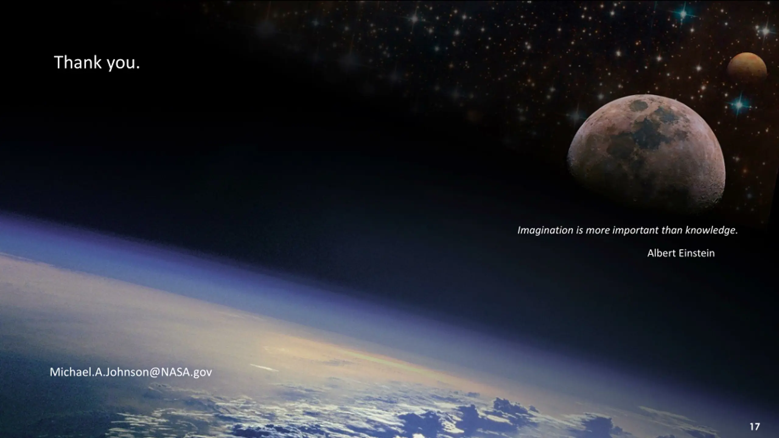 Thank you. Imagination is more important than knowledge. Albert Einstein Michael.A.Johnson@NASA.gov 17