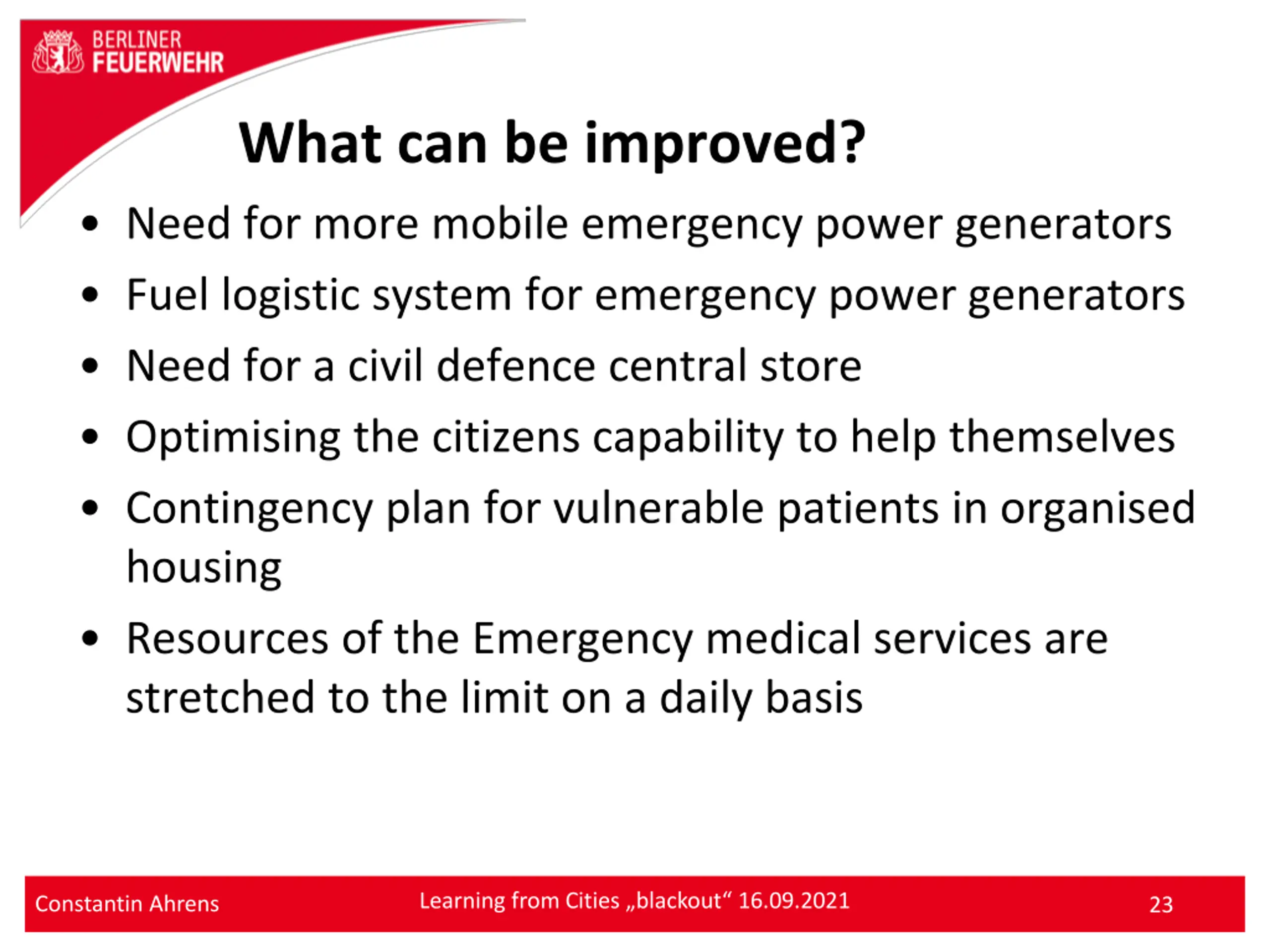 What can be improved? Need for more mobile emergency power generators Fuel logistic system for emergency power generators Need for a civil defence central store Optimising the citizens capability to help themselves Contingency plan for vulnerable patients in organised housing Resources of the Emergency medical services are stretched to the limit on a daily basis Learning from Cities blackout 16.09.2021 Constantin Ahrens 23