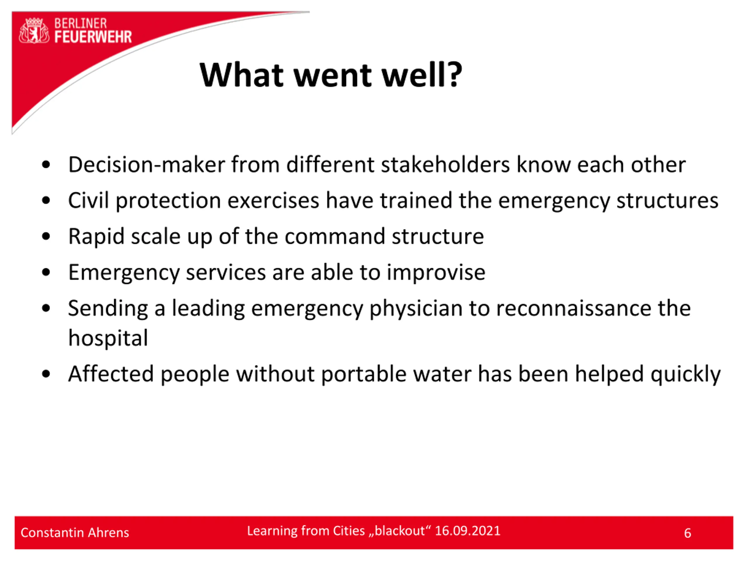What went well? Decision-maker from different stakeholders know each other Civil protection exercises have trained the emergency structures Rapid scale up of the command structure Emergency services are able to improvise Sending a leading emergency physician to reconnaissance the hospital Affected people without portable water has been helped quickly Learning from Cities blackout 16.09.2021 Constantin Ahrens 6