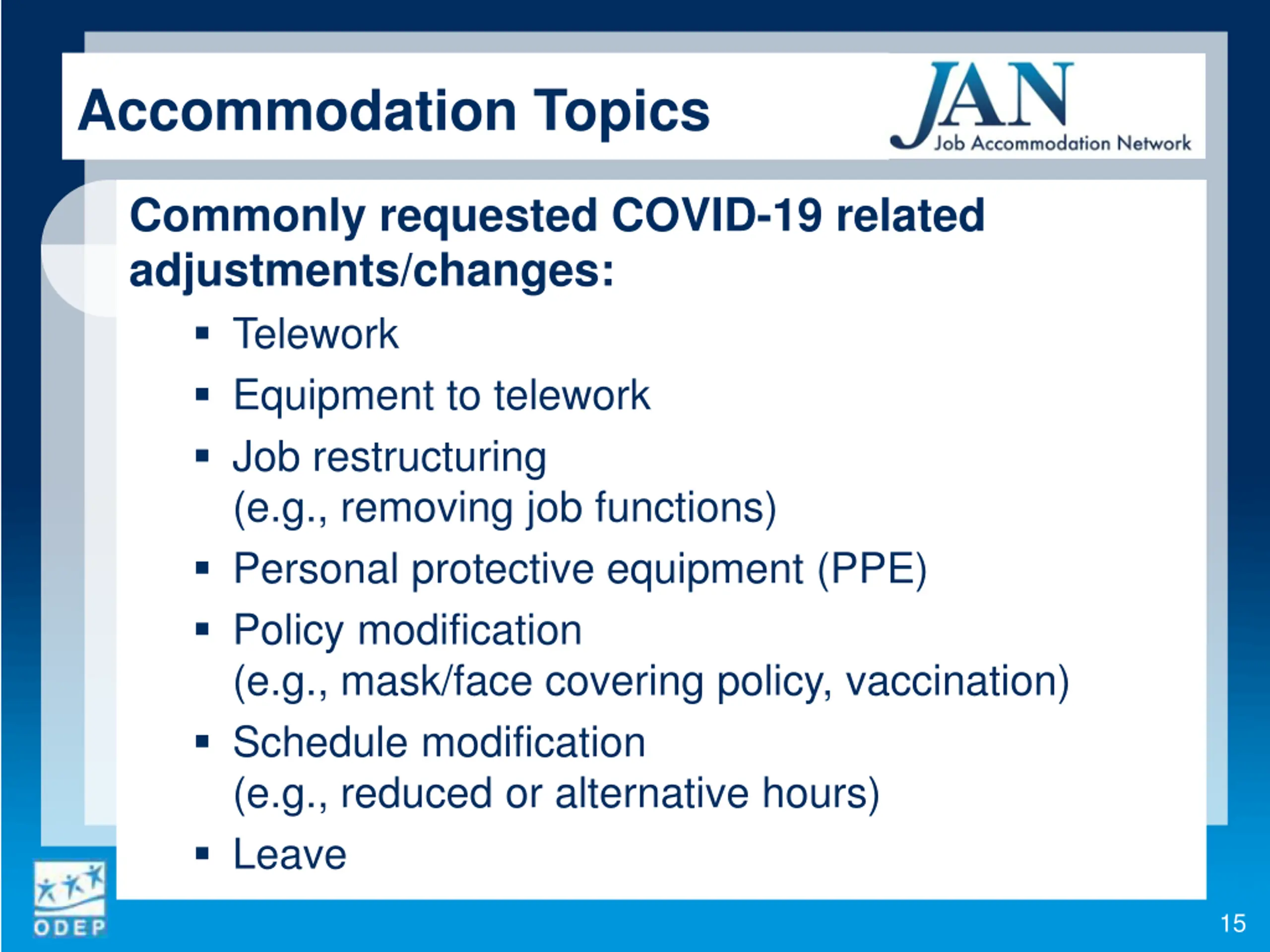 Accommodation Topics Commonly requested COVID-19 related adjustments/changes: Telework Equipment to telework Job restructuring (e.g., removing job functions) Personal protective equipment (PPE) Policy modification (e.g., mask/face covering policy, vaccination) Schedule modification (e.g., reduced or alternative hours) Leave 15