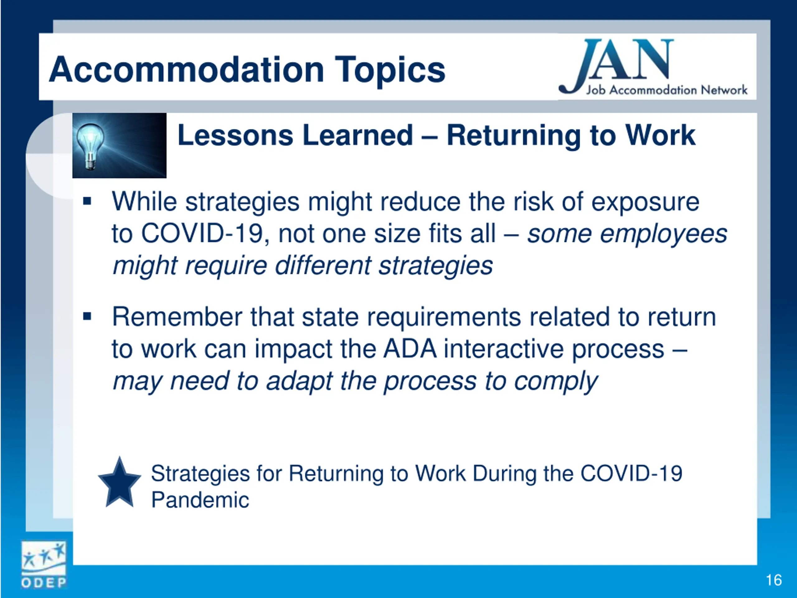 Accommodation Topics Lessons Learned Returning to Work While strategies might reduce the risk of exposure to COVID-19, not one size fits all some employees might require different strategies Remember that state requirements related to return to work can impact the ADA interactive process may need to adapt the process to comply Strategies for Returning to Work During the COVID-19 Pandemic 16