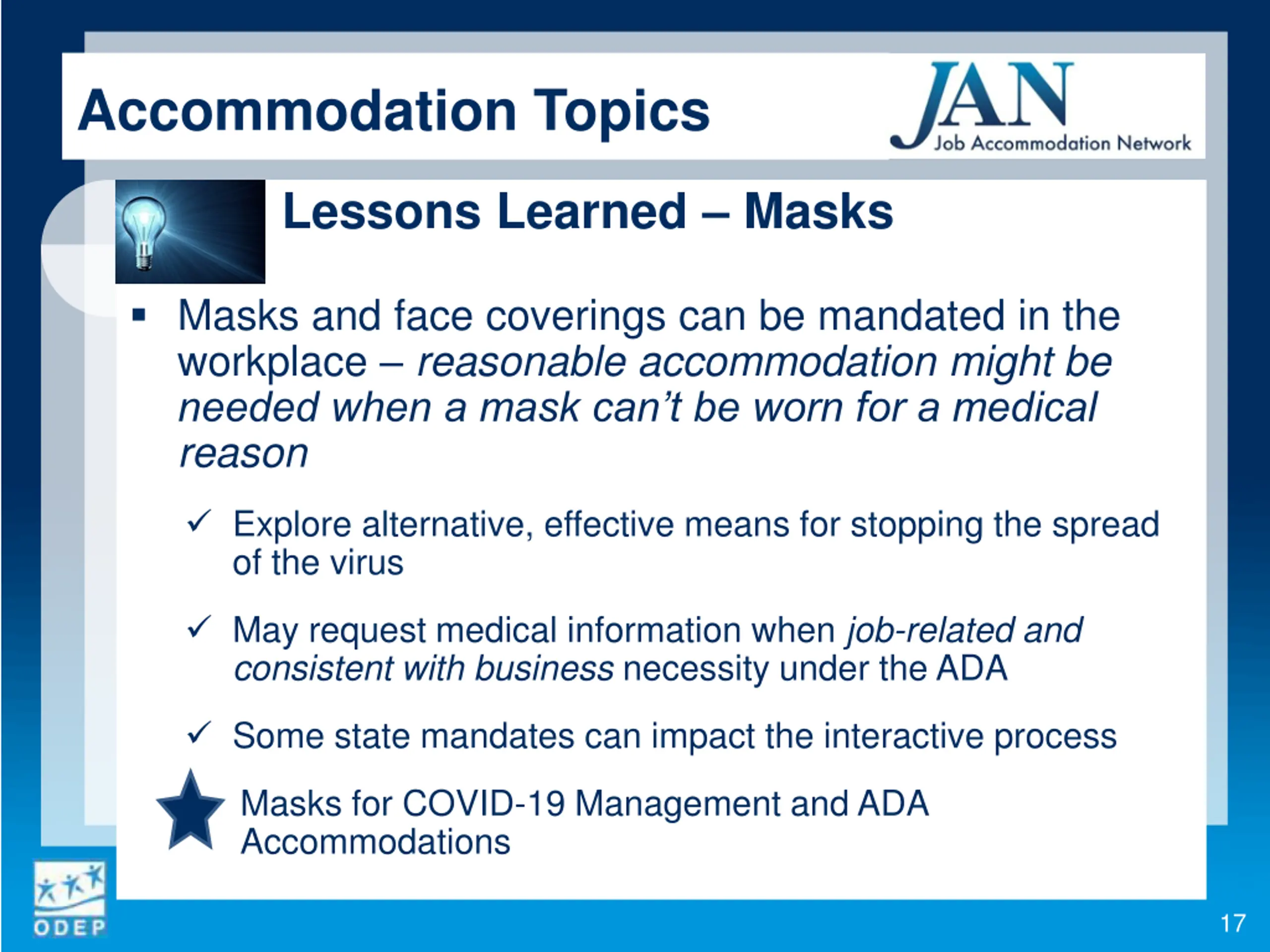 Accommodation Topics Lessons Learned Masks Masks and face coverings can be mandated in the workplace reasonable accommodation might be needed when a mask can t be worn for a medical reason Explore alternative, effective means for stopping the spread of the virus May request medical information when job-related and consistent with business necessity under the ADA Some state mandates can impact the interactive process Masks for COVID-19 Management and ADA Accommodations 17