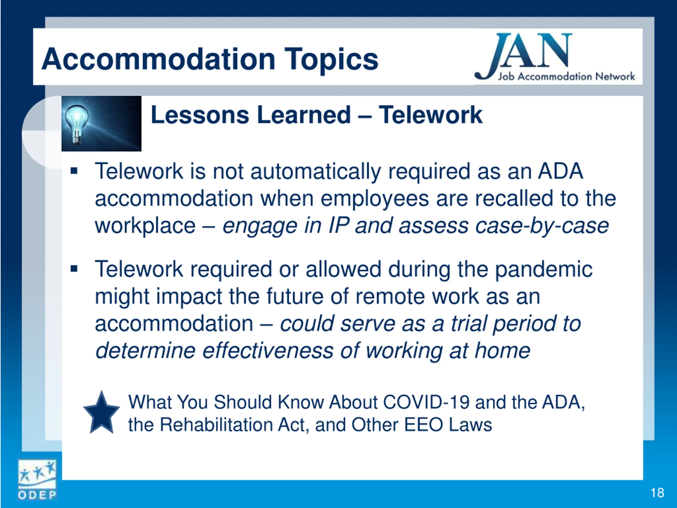 Accommodation Topics Lessons Learned Telework Telework is not automatically required as an ADA accommodation when employees are recalled to the workplace engage in IP and assess case-by-case Telework required or allowed during the pandemic might impact the future of remote work as an accommodation could serve as a trial period to determine effectiveness of working at home What You Should Know About COVID-19 and the ADA, the Rehabilitation Act, and Other EEO Laws 18