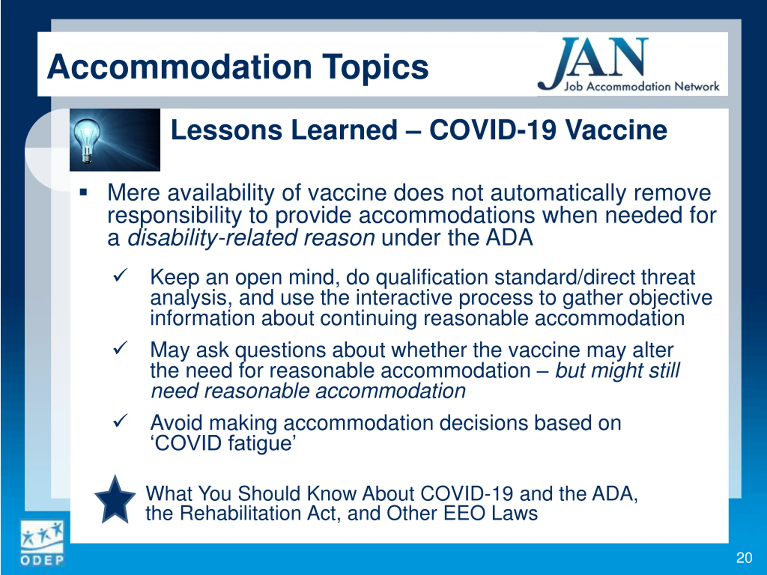Accommodation Topics Lessons Learned COVID-19 Vaccine Mere availability of vaccine does not automatically remove responsibility to provide accommodations when needed for a disability-related reason under the ADA Keep an open mind, do qualification standard/direct threat analysis, and use the interactive process to gather objective information about continuing reasonable accommodation May ask questions about whether the vaccine may alter the need for reasonable accommodation but might still need reasonable accommodation Avoid making accommodation decisions based on COVID fatigue What You Should Know About COVID-19 and the ADA, the Rehabilitation Act, and Other EEO Laws 20