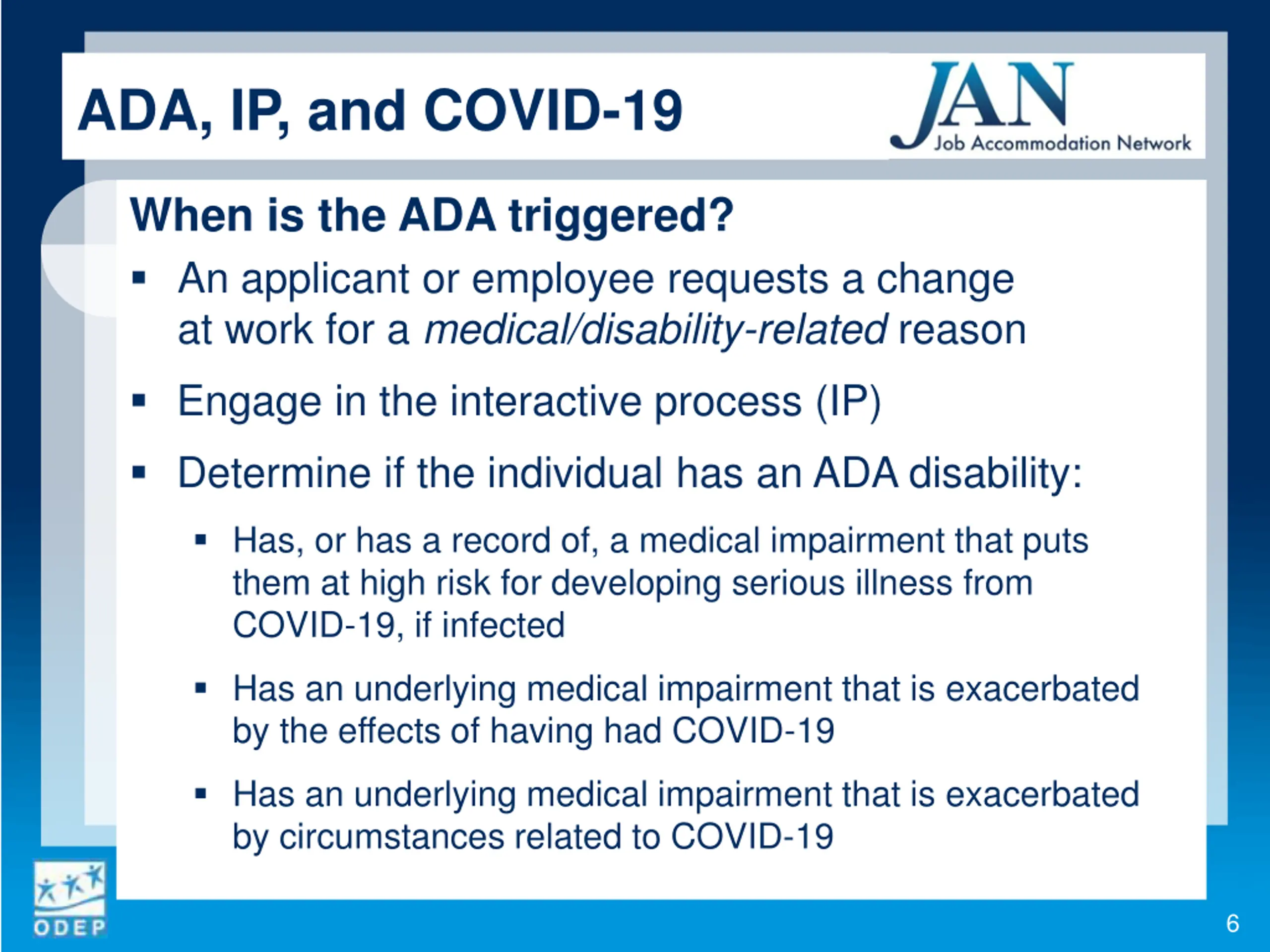 ADA, IP, and COVID-19 Lessons Learned Compliance Compliance can be complex a practical, flexible approach to the IP can be constructive Federal law covers a wide landscape check the boxes to determine which law(s) applies What is the basis for the accommodation request? Some states have issued laws, mandates, and standards that can impact the ADA interactive process may need to adapt the process to comply 5
