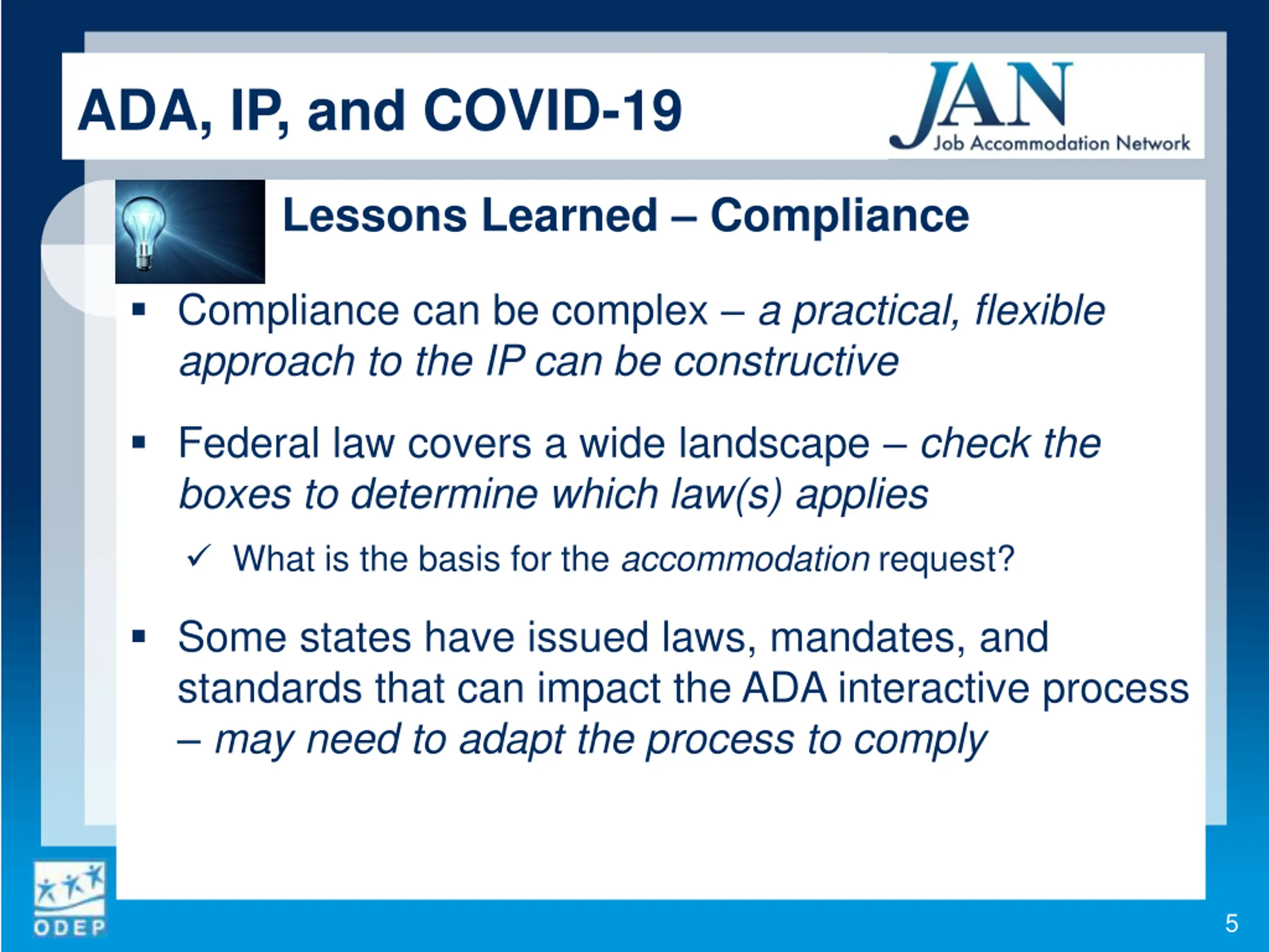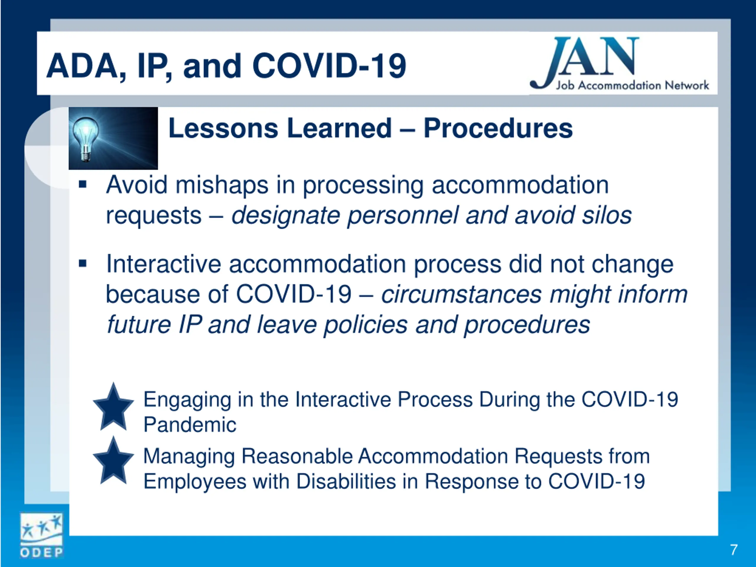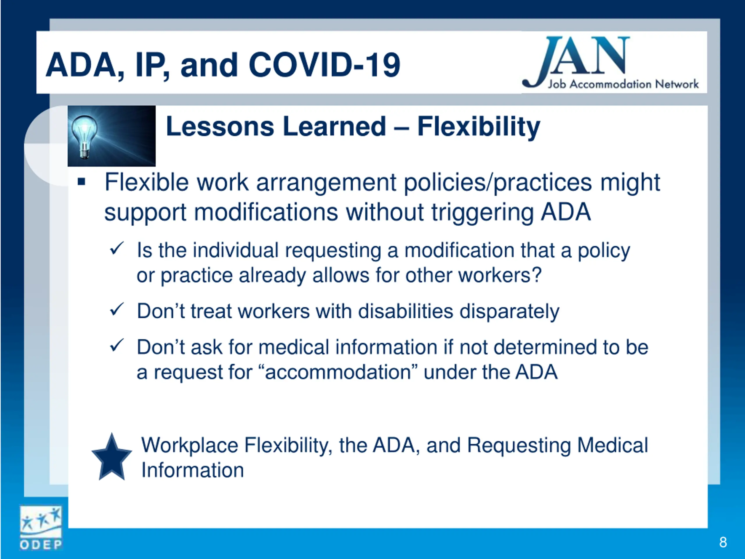 ADA, IP, and COVID-19 Lessons Learned Procedures Avoid mishaps in processing accommodation requests designate personnel and avoid silos Interactive accommodation process did not change because of COVID-19 circumstances might inform future IP and leave policies and procedures Engaging in the Interactive Process During the COVID-19 Pandemic Managing Reasonable Accommodation Requests from Employees with Disabilities in Response to COVID-19 7
