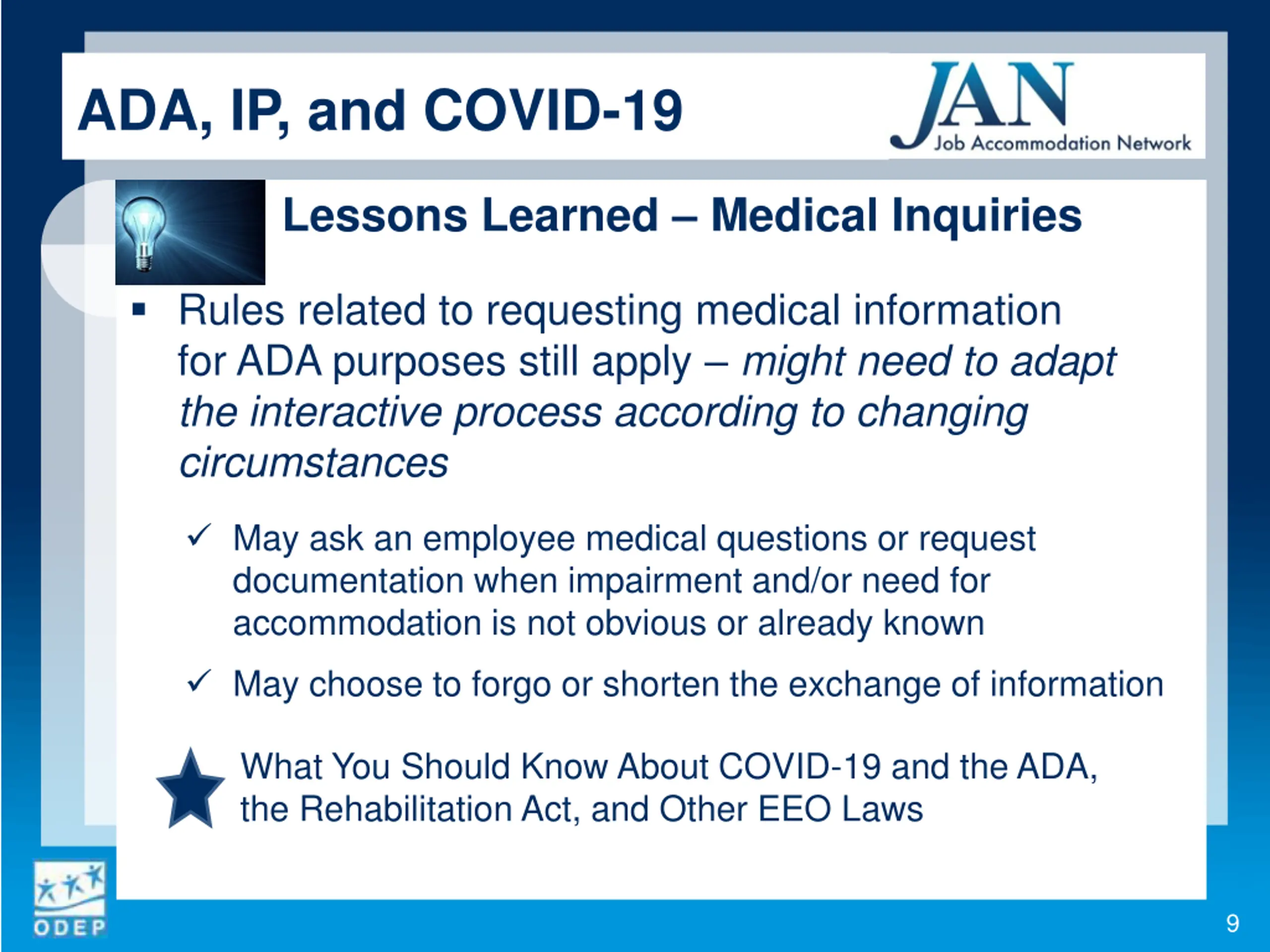 ADA, IP, and COVID-19 Lessons Learned Flexibility Flexible work arrangement policies/practices might support modifications without triggering ADA Is the individual requesting a modification that a policy or practice already allows for other workers? Don t treat workers with disabilities disparately Don t ask for medical information if not determined to be a request for accommodation under the ADA Workplace Flexibility, the ADA, and Requesting Medical Information 8