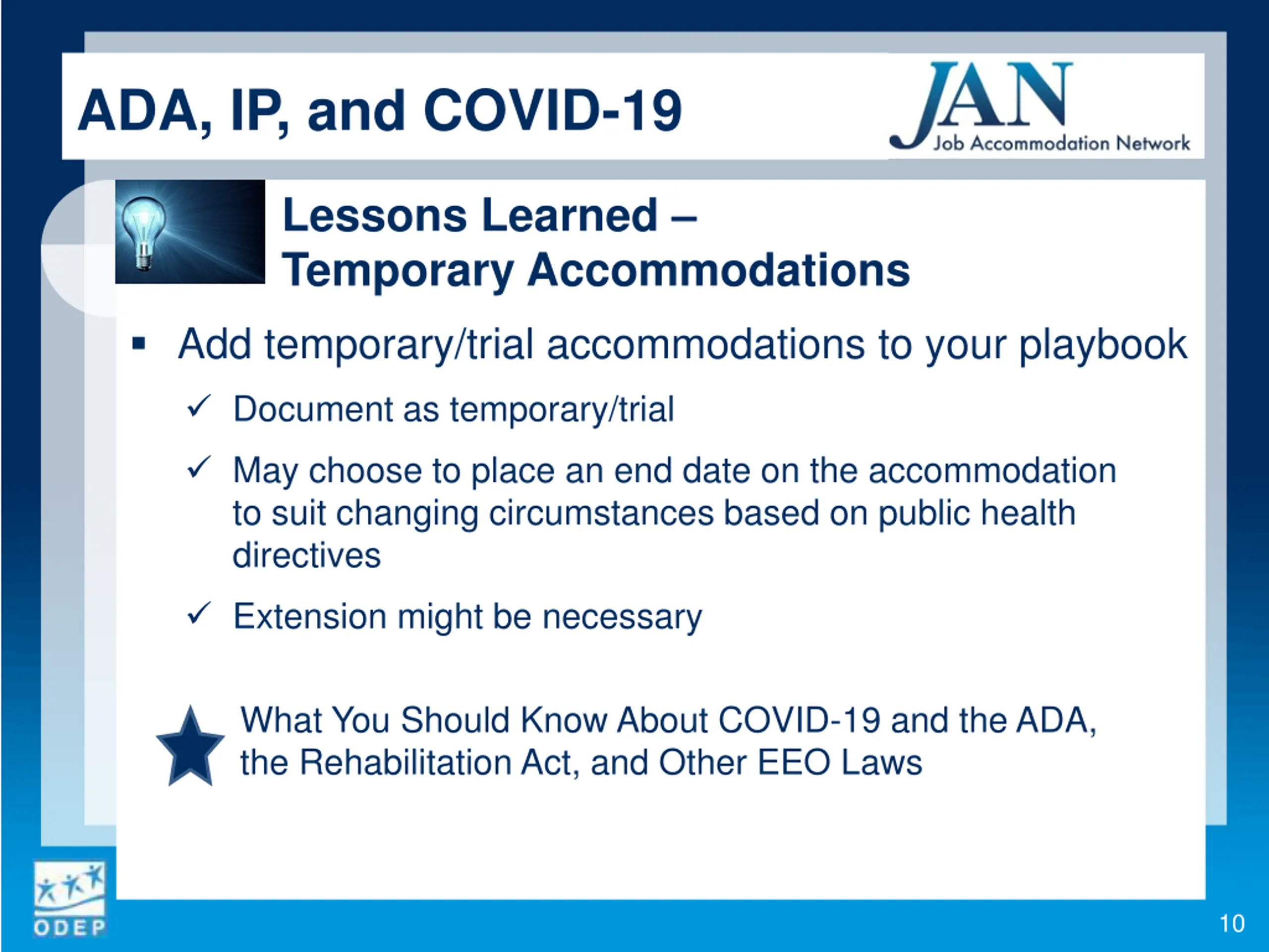 ADA, IP, and COVID-19 Lessons Learned Temporary Accommodations Add temporary/trial accommodations to your playbook Document as temporary/trial May choose to place an end date on the accommodation to suit changing circumstances based on public health directives Extension might be necessary What You Should Know About COVID-19 and the ADA, the Rehabilitation Act, and Other EEO Laws 10