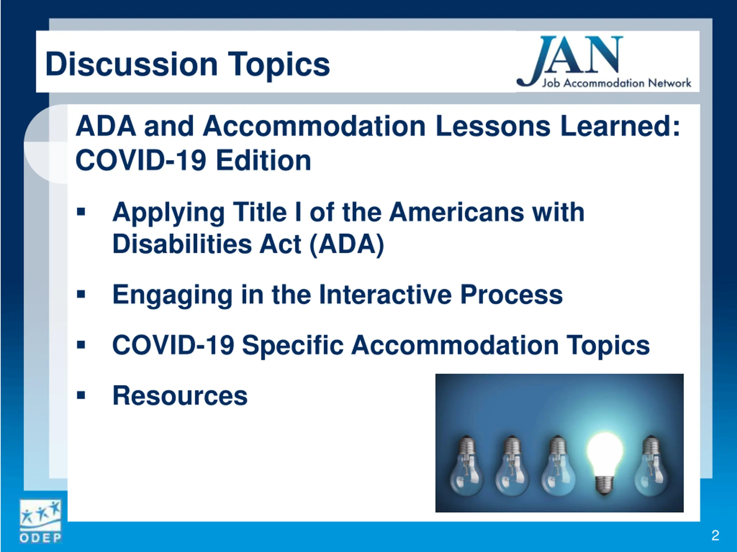 Discussion Topics ADA and Accommodation Lessons Learned: COVID-19 Edition Applying Title I of the Americans with Disabilities Act (ADA) Engaging in the Interactive Process COVID-19 Specific Accommodation Topics Resources 2