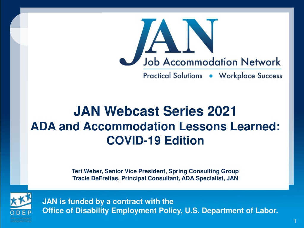 JAN Webcast Series 2021 ADA and Accommodation Lessons Learned: COVID-19 Edition Teri Weber, Senior Vice President, Spring Consulting Group Tracie DeFreitas, Principal Consultant, ADA Specialist, JAN JAN is funded by a contract with the Office of Disability Employment Policy, U.S. Department of Labor. 1