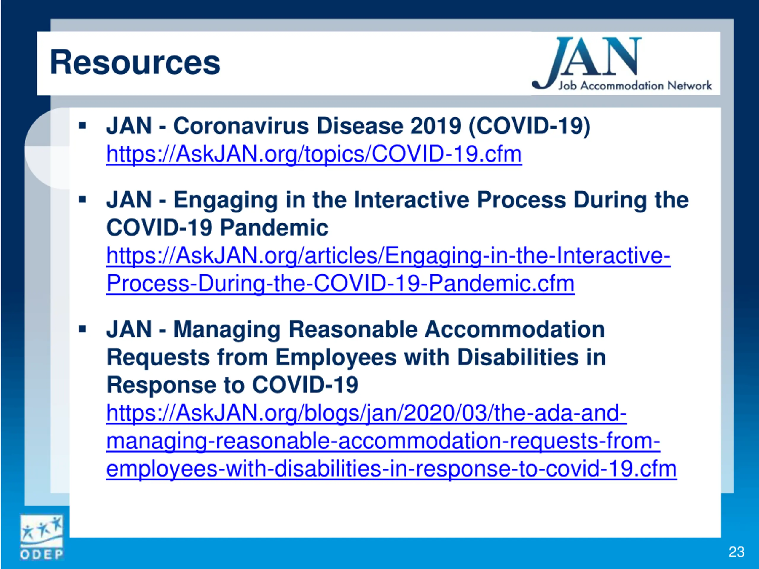 Resources JAN - Coronavirus Disease 2019 (COVID-19) https://AskJAN.org/topics/COVID-19.cfm JAN - Engaging in the Interactive Process During the COVID-19 Pandemic https://AskJAN.org/articles/Engaging-in-the-Interactive- Process-During-the-COVID-19-Pandemic.cfm JAN - Managing Reasonable Accommodation Requests from Employees with Disabilities in Response to COVID-19 https://AskJAN.org/blogs/jan/2020/03/the-ada-and- managing-reasonable-accommodation-requests-from- employees-with-disabilities-in-response-to-covid-19.cfm 23