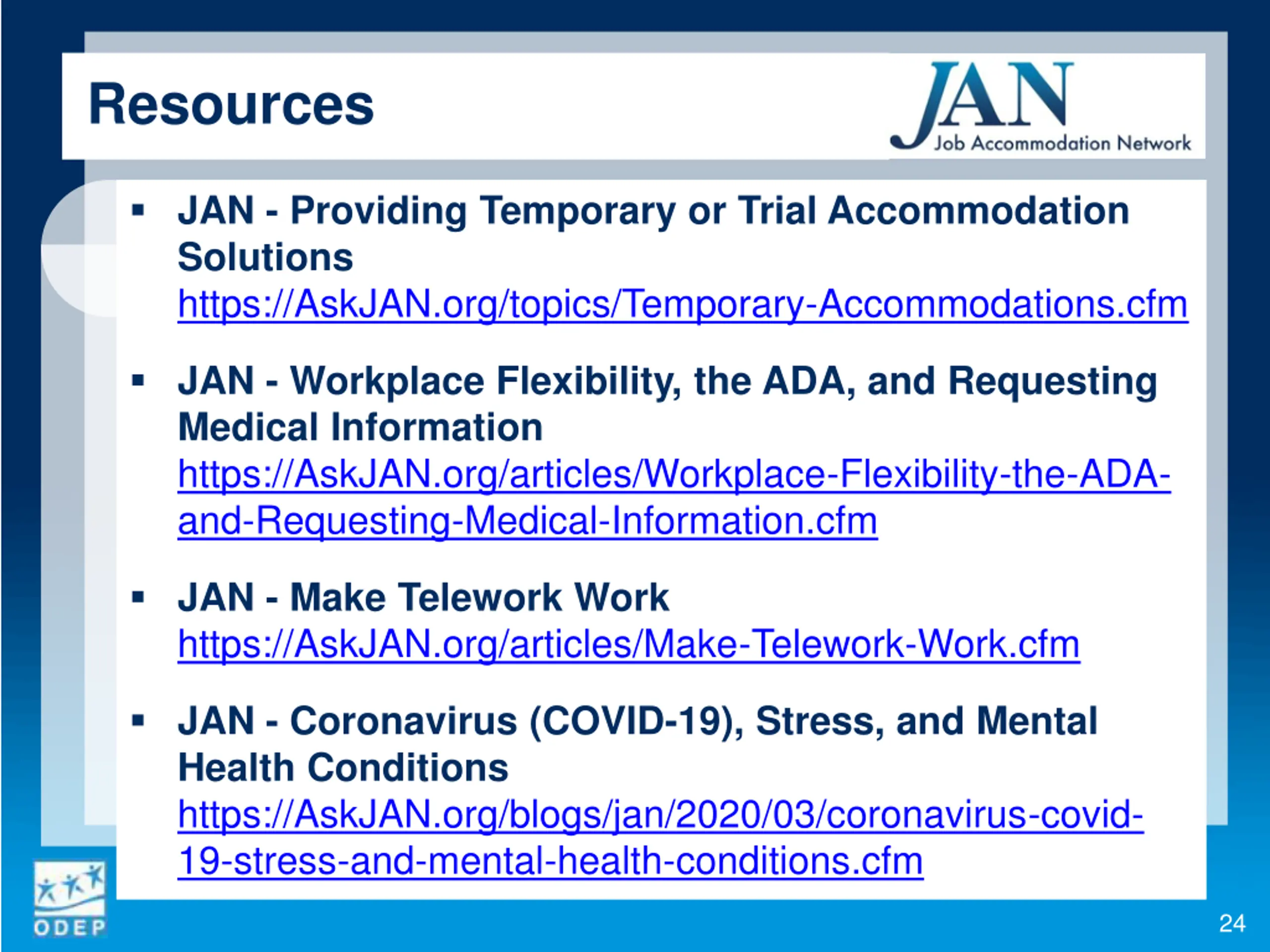 Resources JAN - Providing Temporary or Trial Accommodation Solutions https://AskJAN.org/topics/Temporary-Accommodations.cfm JAN - Workplace Flexibility, the ADA, and Requesting Medical Information https://AskJAN.org/articles/Workplace-Flexibility-the-ADA- and-Requesting-Medical-Information.cfm JAN - Make Telework Work https://AskJAN.org/articles/Make-Telework-Work.cfm JAN - Coronavirus (COVID-19), Stress, and Mental Health Conditions https://AskJAN.org/blogs/jan/2020/03/coronavirus-covid- 19-stress-and-mental-health-conditions.cfm 24
